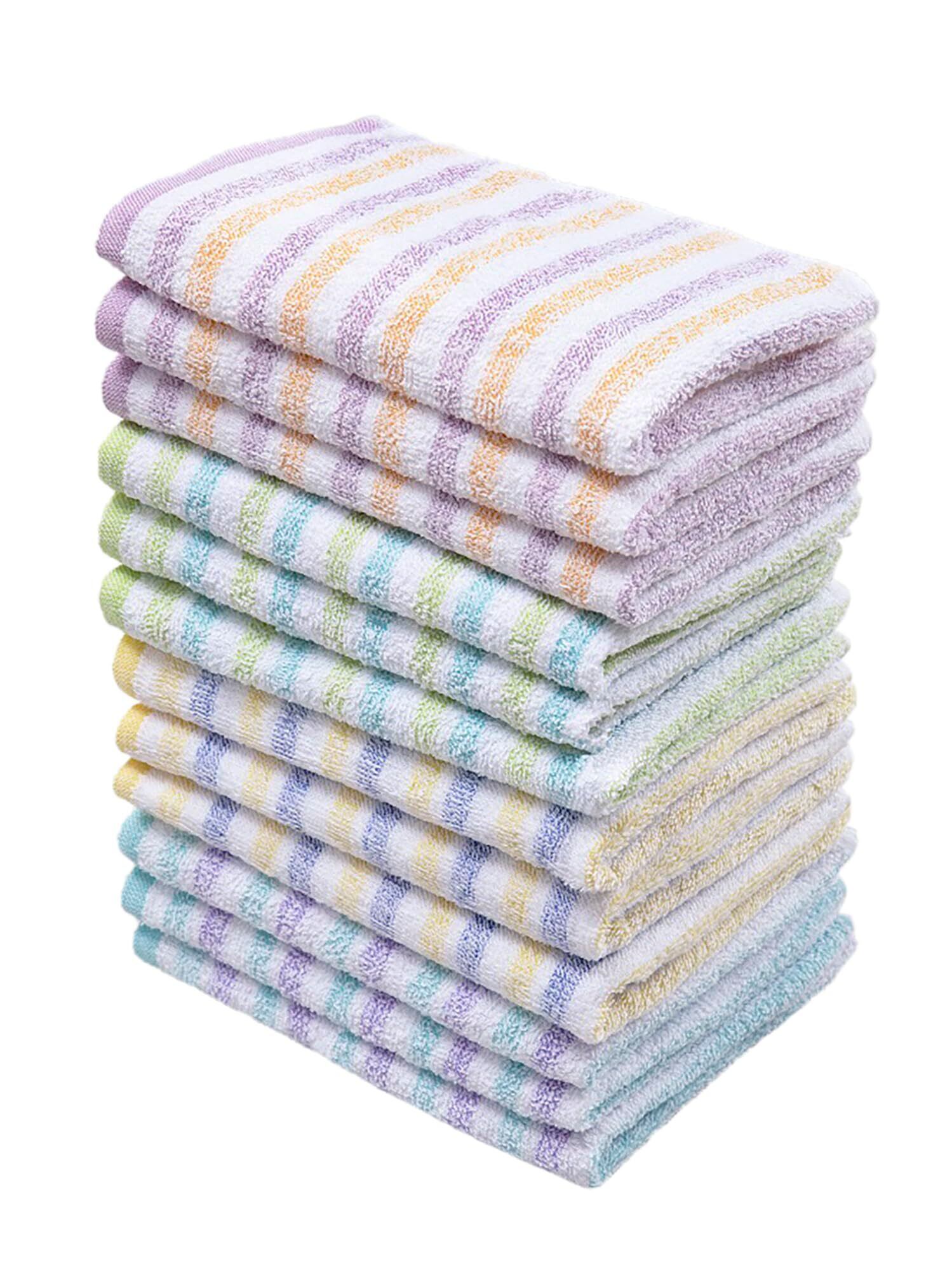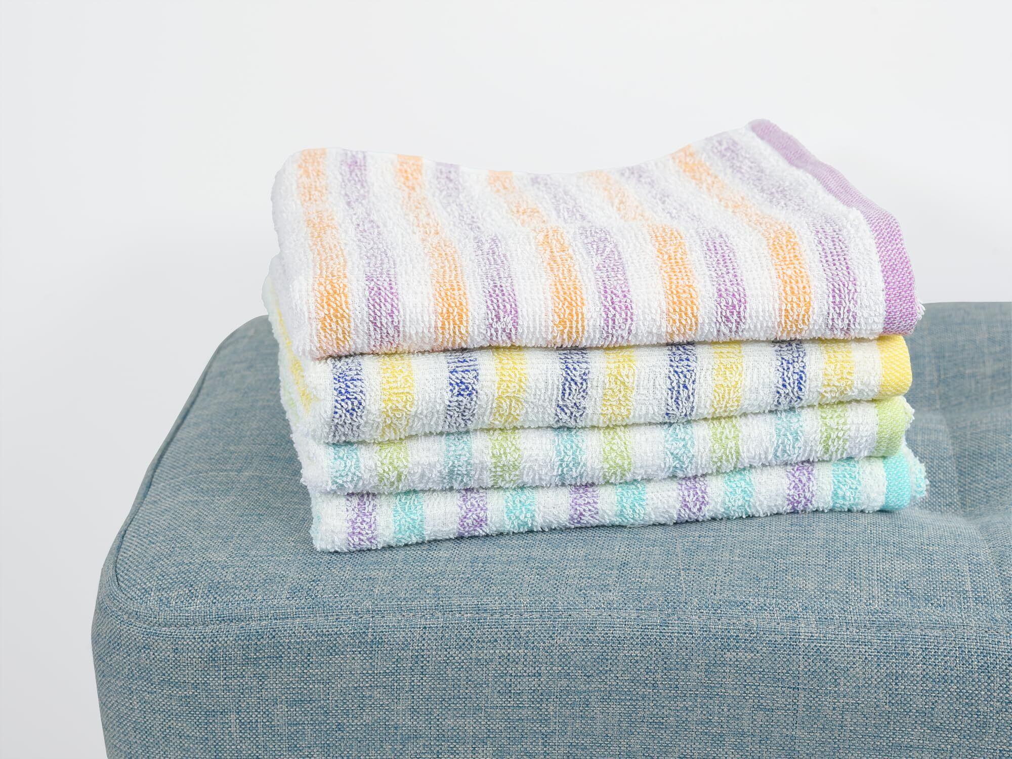 【どどーんと、まとめて! 】たっぷりつかえる大容量! ボーダー柄のフェイスタオル4色12枚セットです。毎日、その日の気分で使い分け! ご家庭はもちろん、業務用としも使いやすいタオルです。