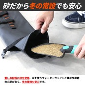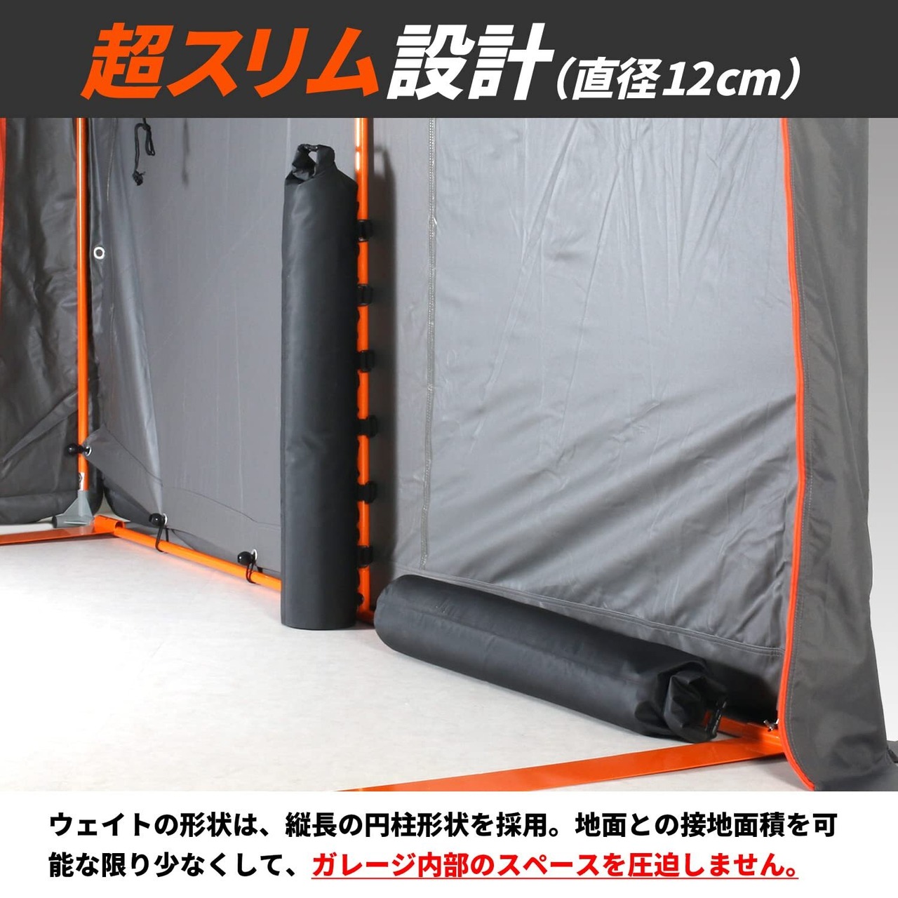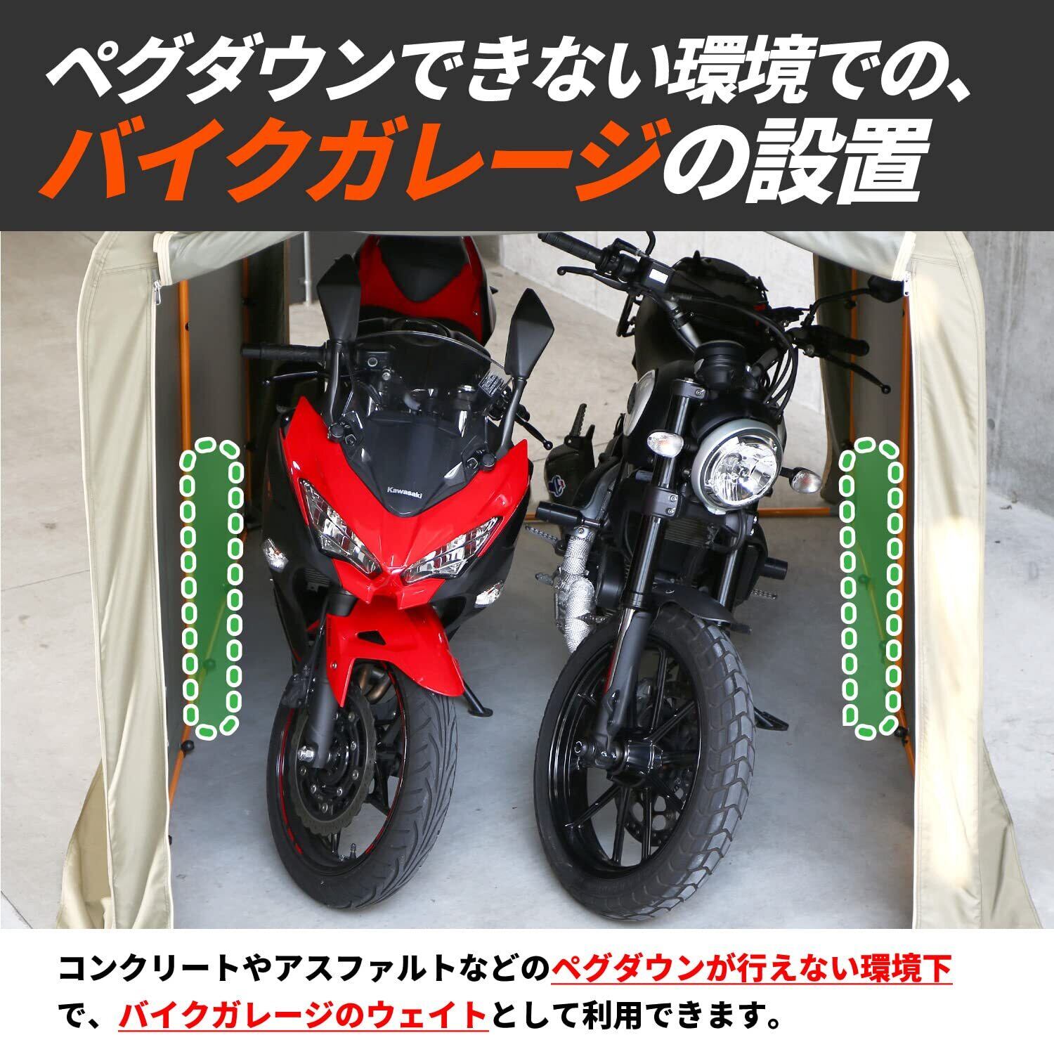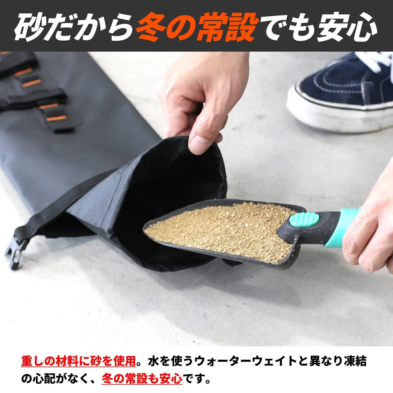 ●ペグダウンできない環境でのバイクガレージの設置に コンクリートやアスファルトなどのペグダウンが行えない環境下で、バイクガレージのウェイトとして利用できます。 ●ガレージ内部を圧迫しないスリム設計 ウェイトの形状は、縦長の円柱形状を採用。 地面との接地面積を可能な限り少なくすることで、ガレージ内部のスペースを圧迫しません。 ●横置きにも対応 ウェイトの設置は縦置き、横置きどちらにも対応。設置環境に応じて自由にレイアウトできます。 ●水を使わないから冬の常設でも安心 砂を使用。水を使うウォーターウェイトと異なり凍結の心配がなく、冬の常設も安心です。 ※内袋付属。 ●多彩な固定方法に対応する、分離式固定ベルト ウェイトの固定用ベルトは取り外しが可能。 ウェイトの側面に設けたデイジーチェーンで付属の固定ベルトを任意の高さに設定できます。
