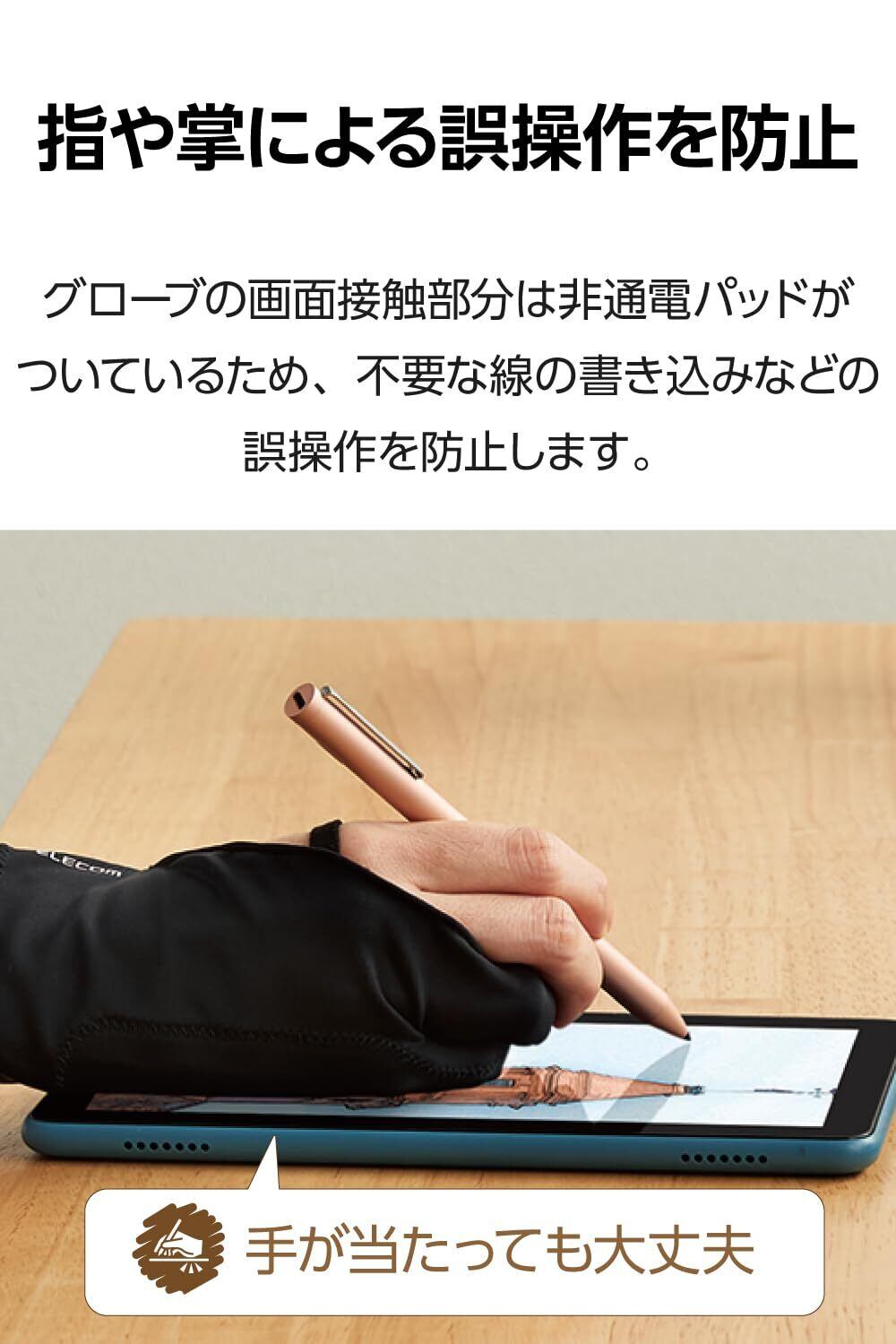 グローブの画面接触部分に非通電パッドがついています。タブレットで絵を描く際に指や掌を誤って感知して起こる、不要な線の描き込みなどの誤操作を防止します。