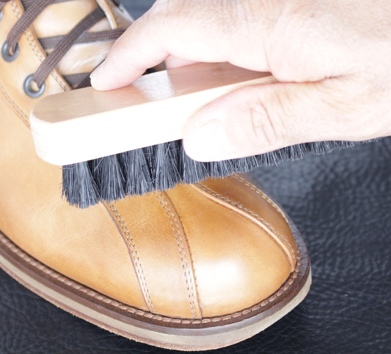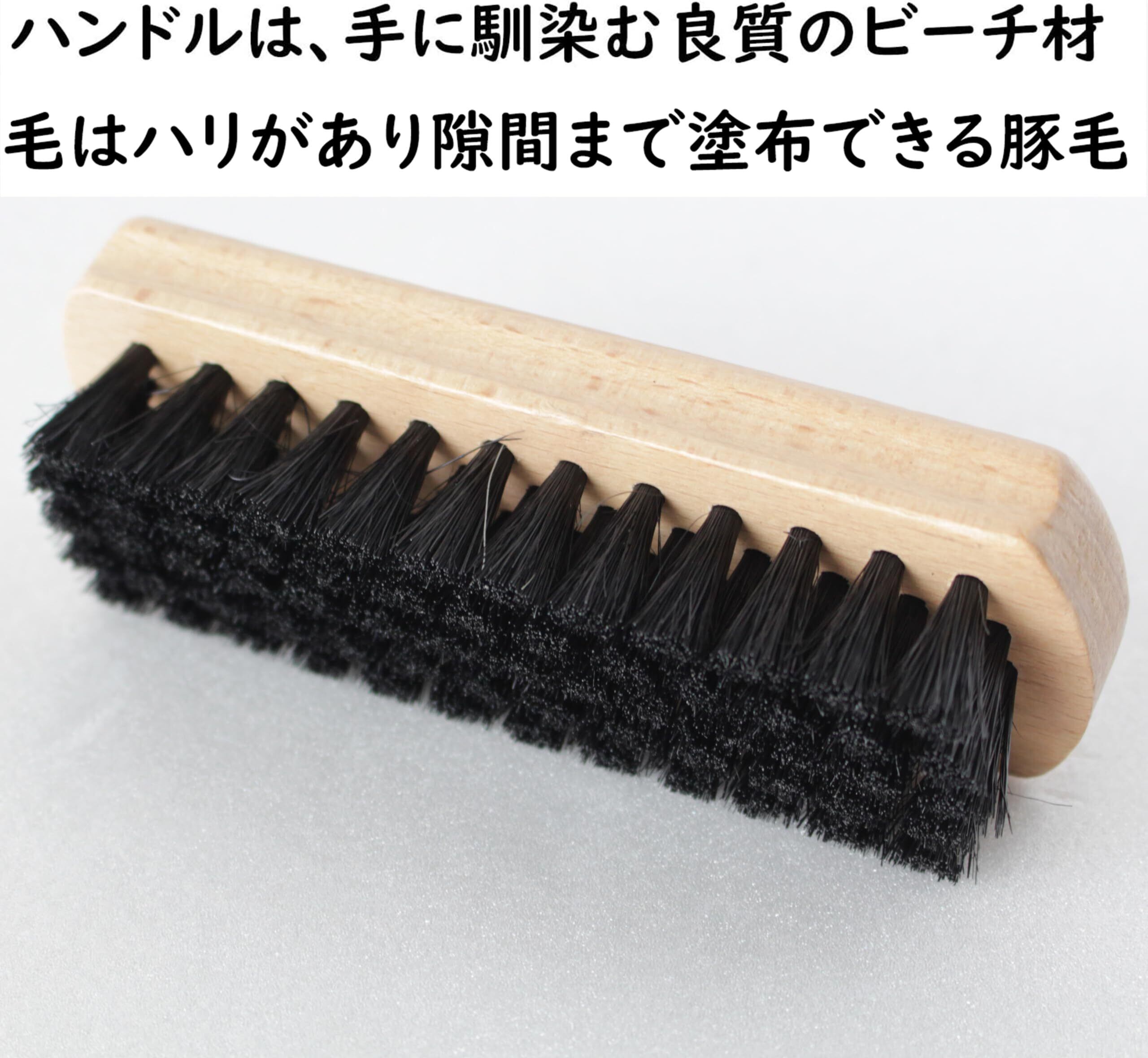 布 や スポンジ でクリームを添付した後の仕上げに 靴クリームを塗った後、 ブラッシングすると 靴になじみ、伸ばすことにより光沢もでます。程よい毛の硬さのある豚毛は革靴の隙間コバにしっかりクリームを入り込ませ馴染みしっかりと靴に光沢感を与えます。