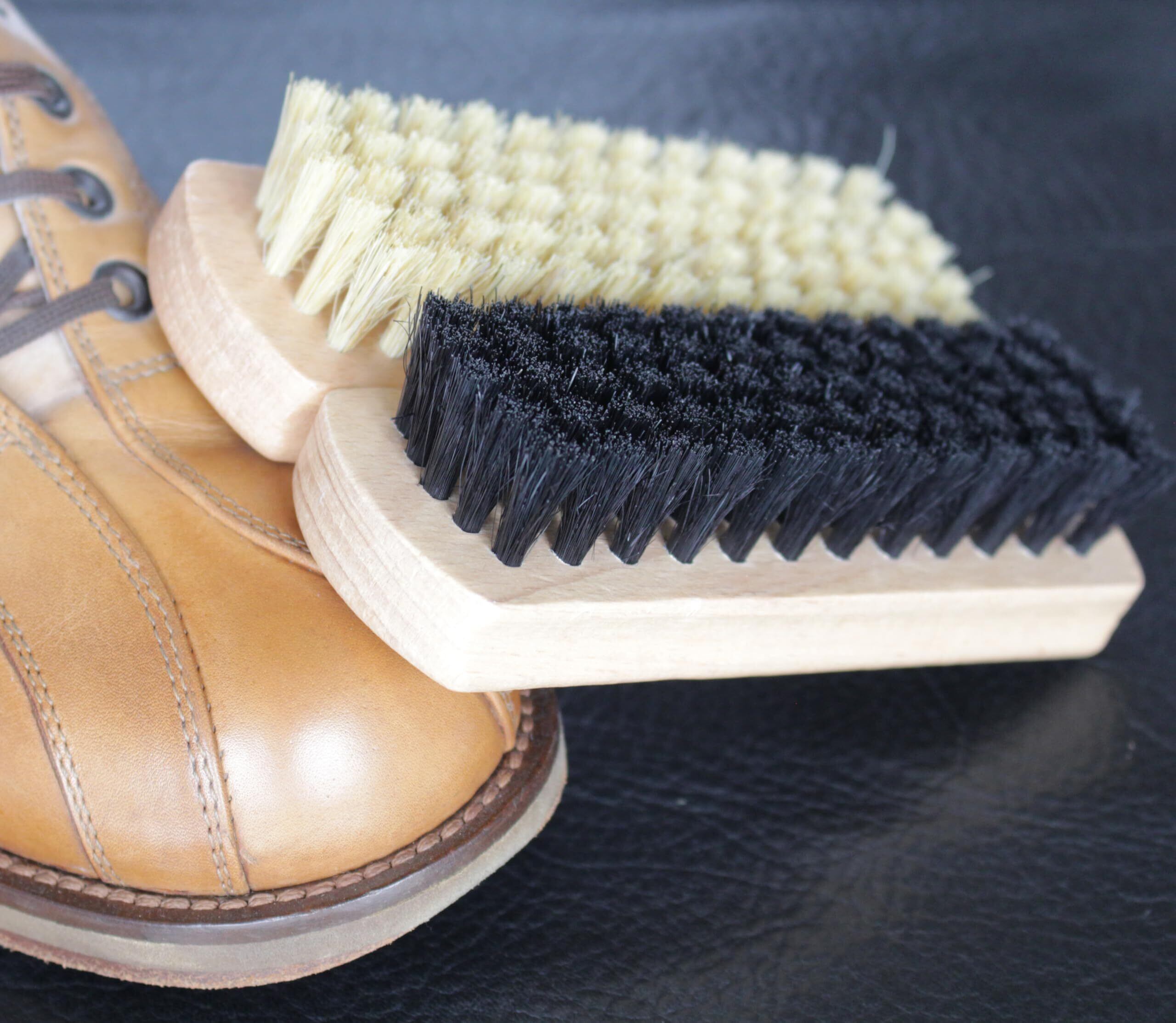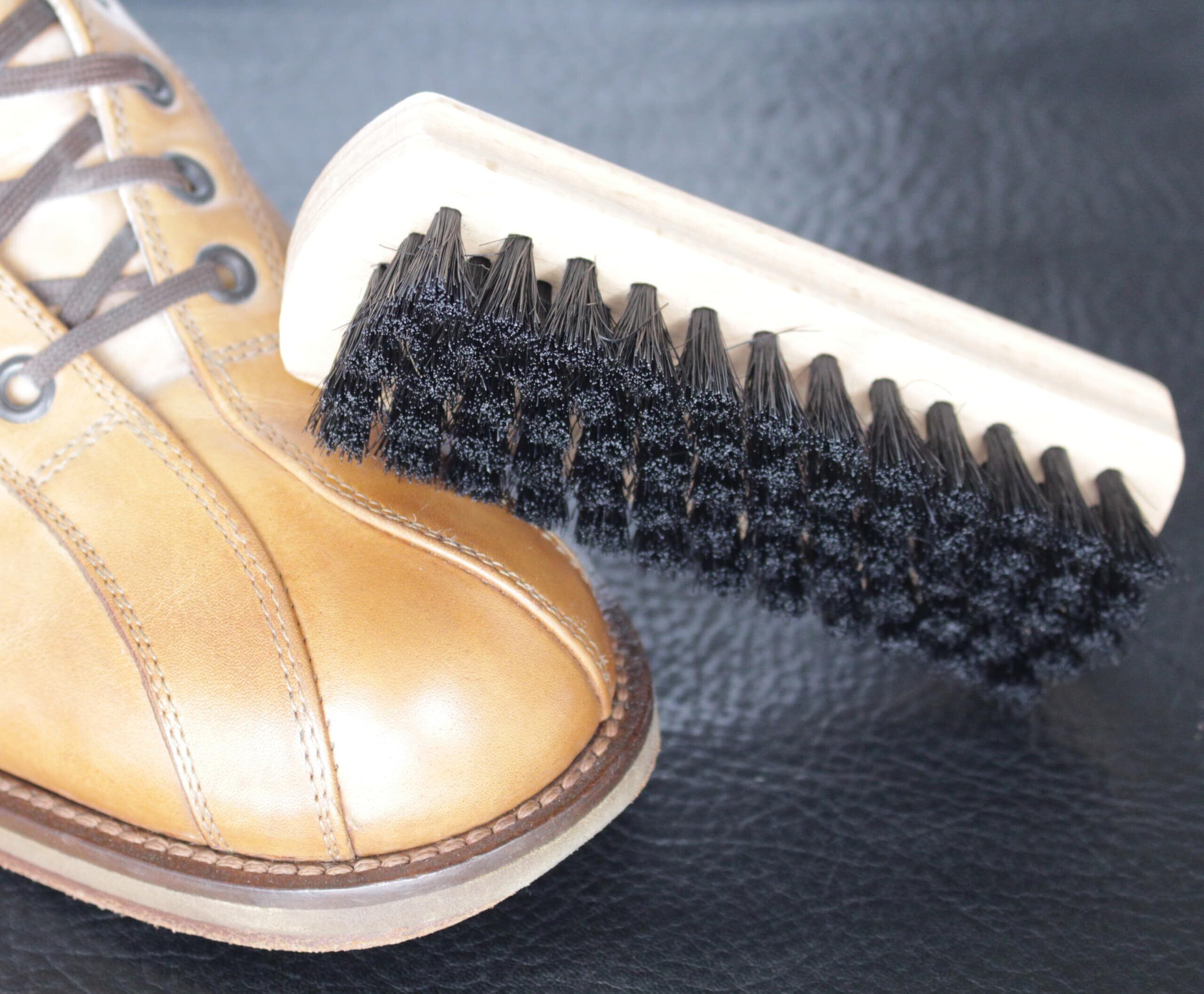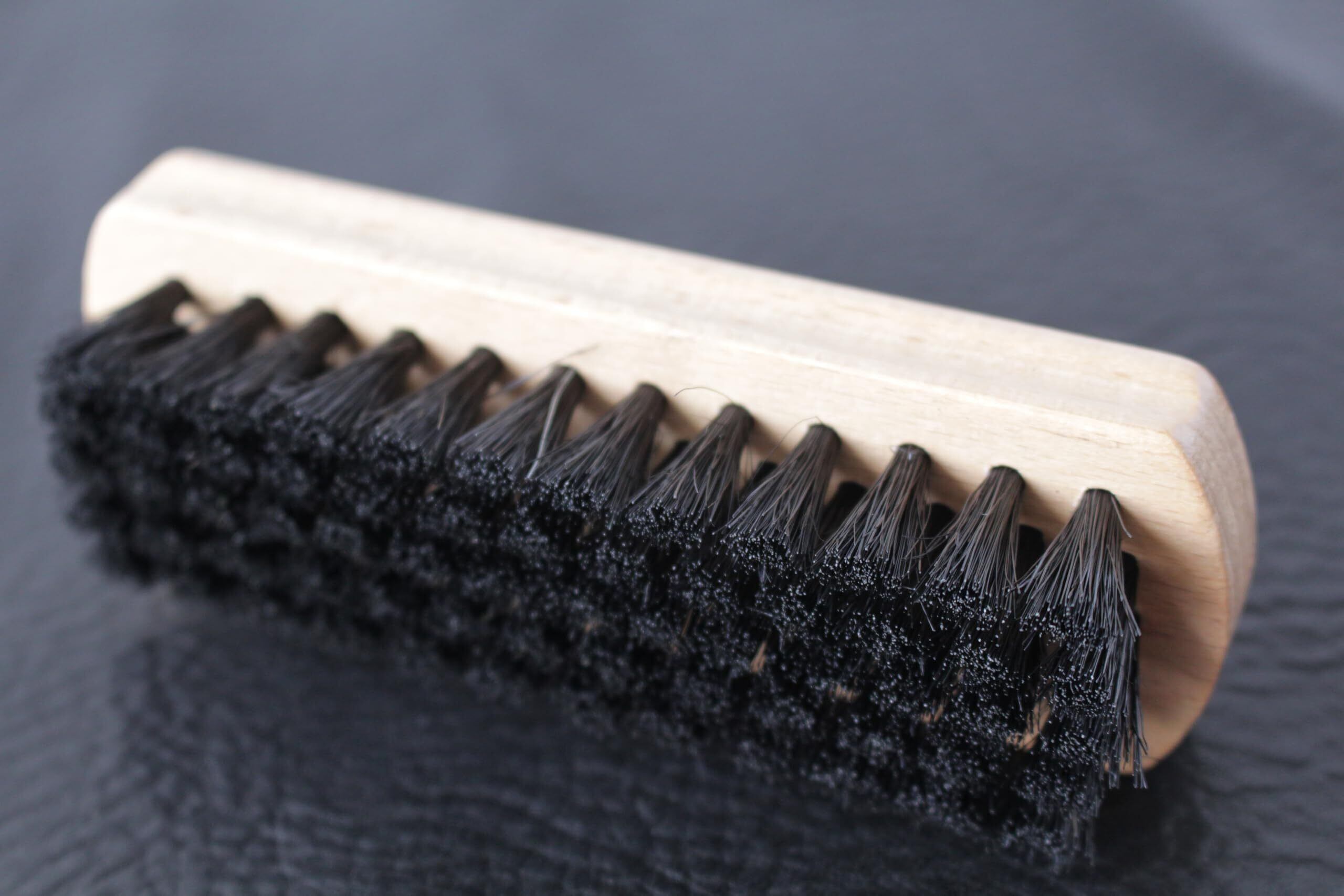 毛の密度が高く毛足も長く程よくしなり皮革にも優しくブラッシングができます。クリームを使用した靴磨きはもちろん、革小物のお手入れやホコリ、汚れ落とし用としてオススメです。クリーミングの豚毛から仕上げブラッシングの馬毛と2段階に使い分けが通な使い方ですが、もちろん馬毛、豚毛単品でブラッシングもOKです。