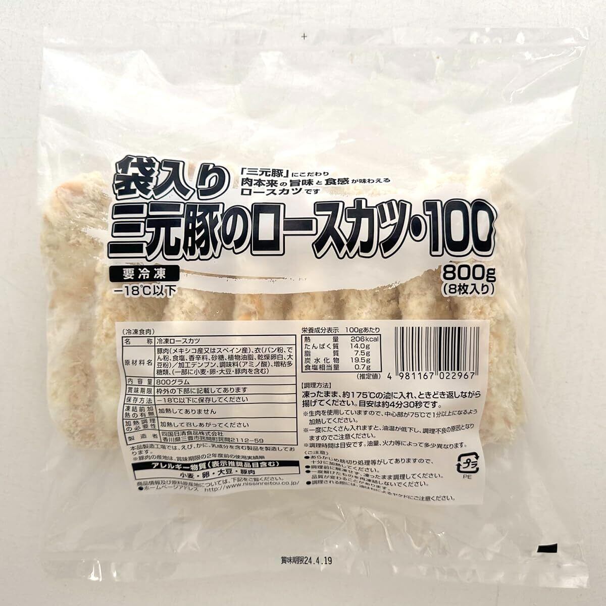 豚肉(メキシコ産又はスペイン産)、衣(パン粉、でん粉、食塩、香辛料、砂糖、植物油脂、乾燥卵白、大豆粉)/加工デンプン、調味料(アミノ酸)、増粘多糖類、(一部に小麦・卵・大豆・豚肉を含む)