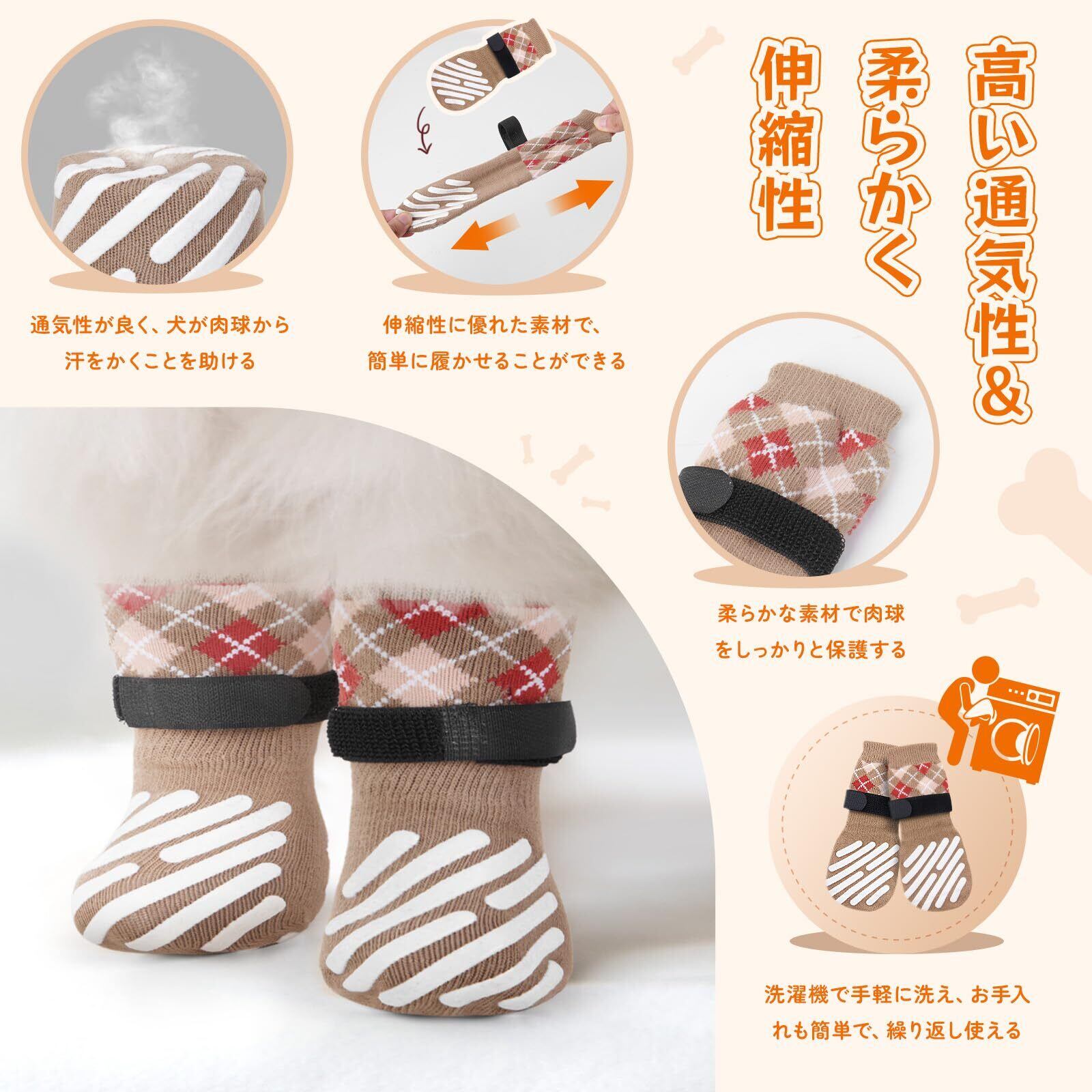LOOBANI 犬 靴下 滑り止め 犬 滑り止め靴下 脱げにくい 老犬の介護 犬用 傷 舐め防止 マジックテープ付き 柔らかい 肉球保護 防寒 転倒防止 通気性 伸縮性 屋内外用 汎用 4個セット (ブラウン, XS)
