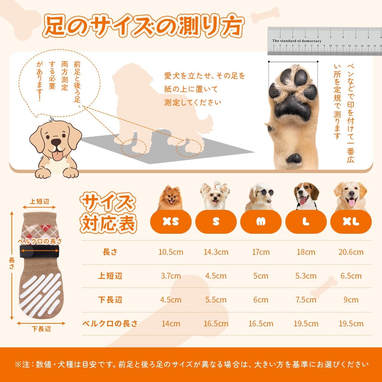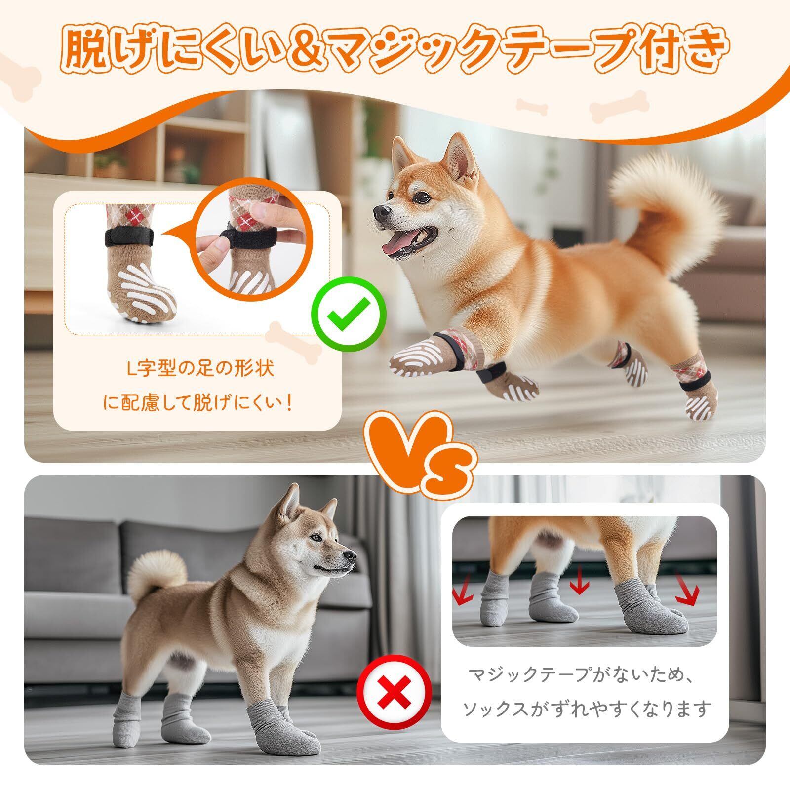 【脱げにくい&マジックテープ付き】 :犬の靴下 滑り止めには高弾性のマジックテープが付いており、犬の足首にしっかりと固定できるだけでなく、サイズに合わせて自由に調節できます。そのため、簡単に犬の足にフィットし、滑り落ちることはありません。さらに、マジックテープの固定に加えて、ソックスの後部には締め付けデザインが施されており、ペットが歩いたり走ったりしてもソックスが脱げないように工夫されています。