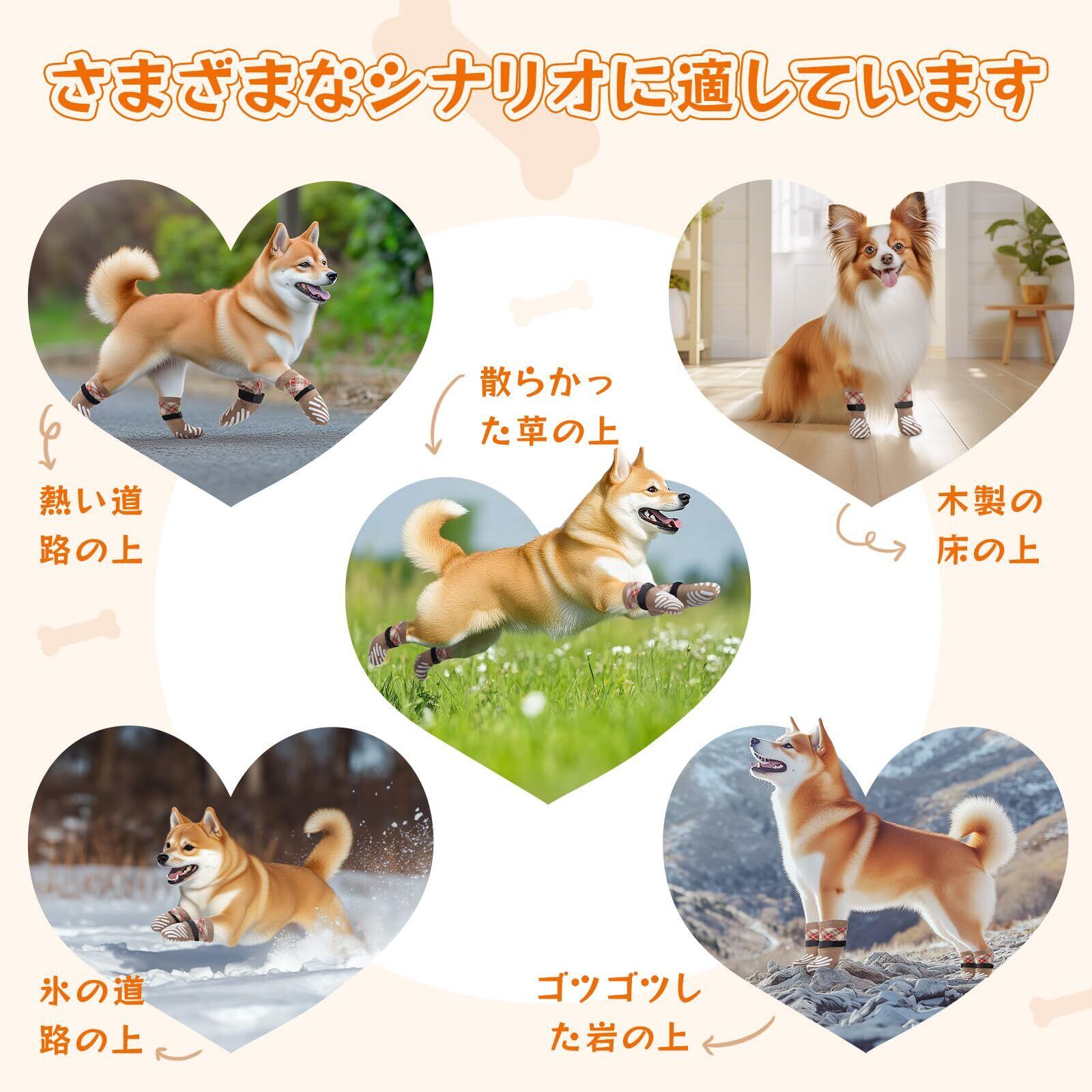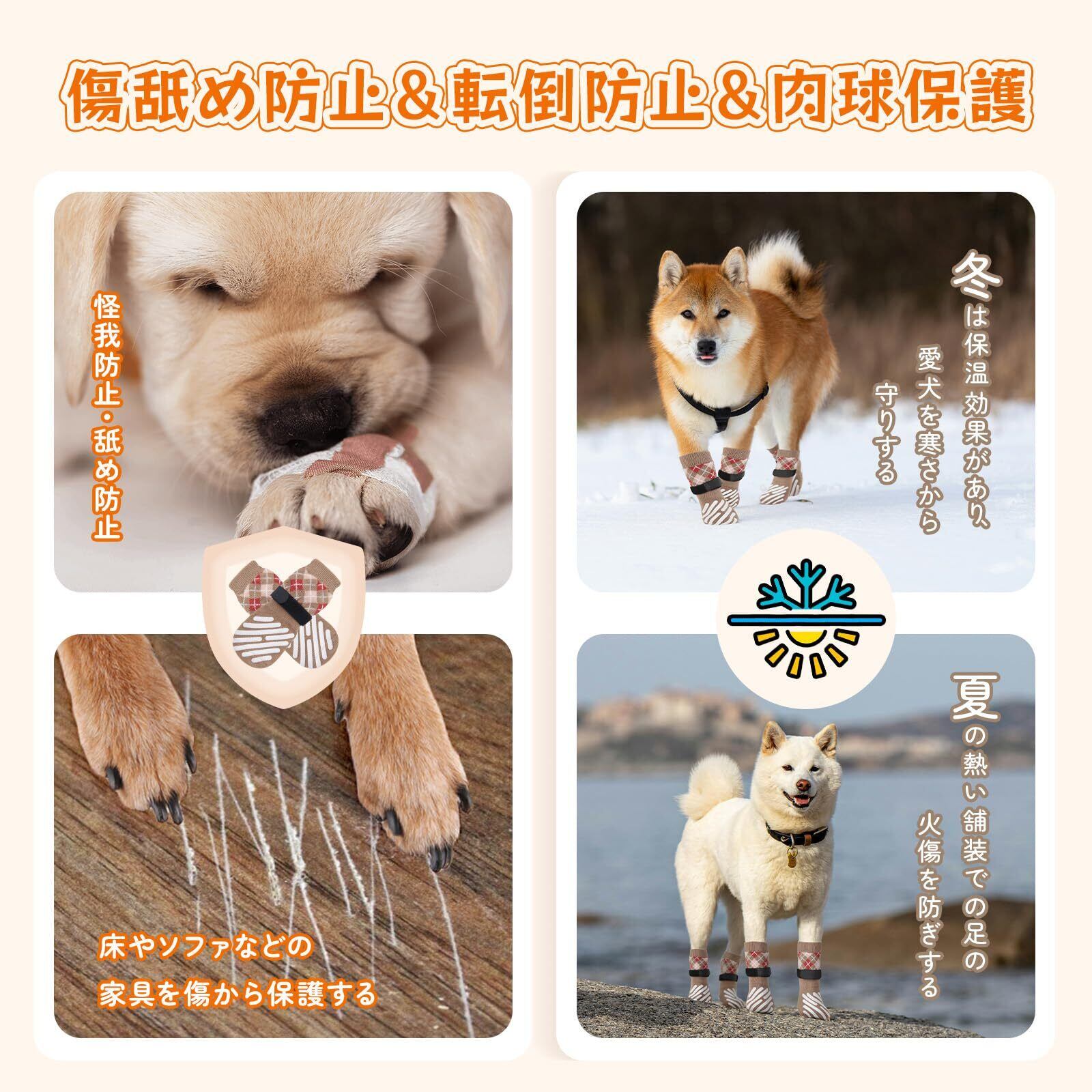 【傷舐め防止&転倒防止&肉球保護】 :犬用靴下 滑り止めは、室内の階段や床での滑り止め効果があり、ペットの足を暖かく清潔に保ちます。また、これらの防滑ソックスは、ペットがハードウッドの床やソファ、その他の家具を傷つけるのを防ぎます。柔らかい靴下 犬を履けば、犬はソファや他の家具にダメージを与える心配がありません。外出時や散歩の際には、犬の足が汚れるのを防ぎ、夏の暑い日差しの下でアスファルトの熱から犬の足を守ることができます。冬には、寒さから犬を保護し、爪のパッドが傷ついたり病気になった場合、舐めて感染を広げないようにする効果もあり、炎症から足を守る役割も果たします。