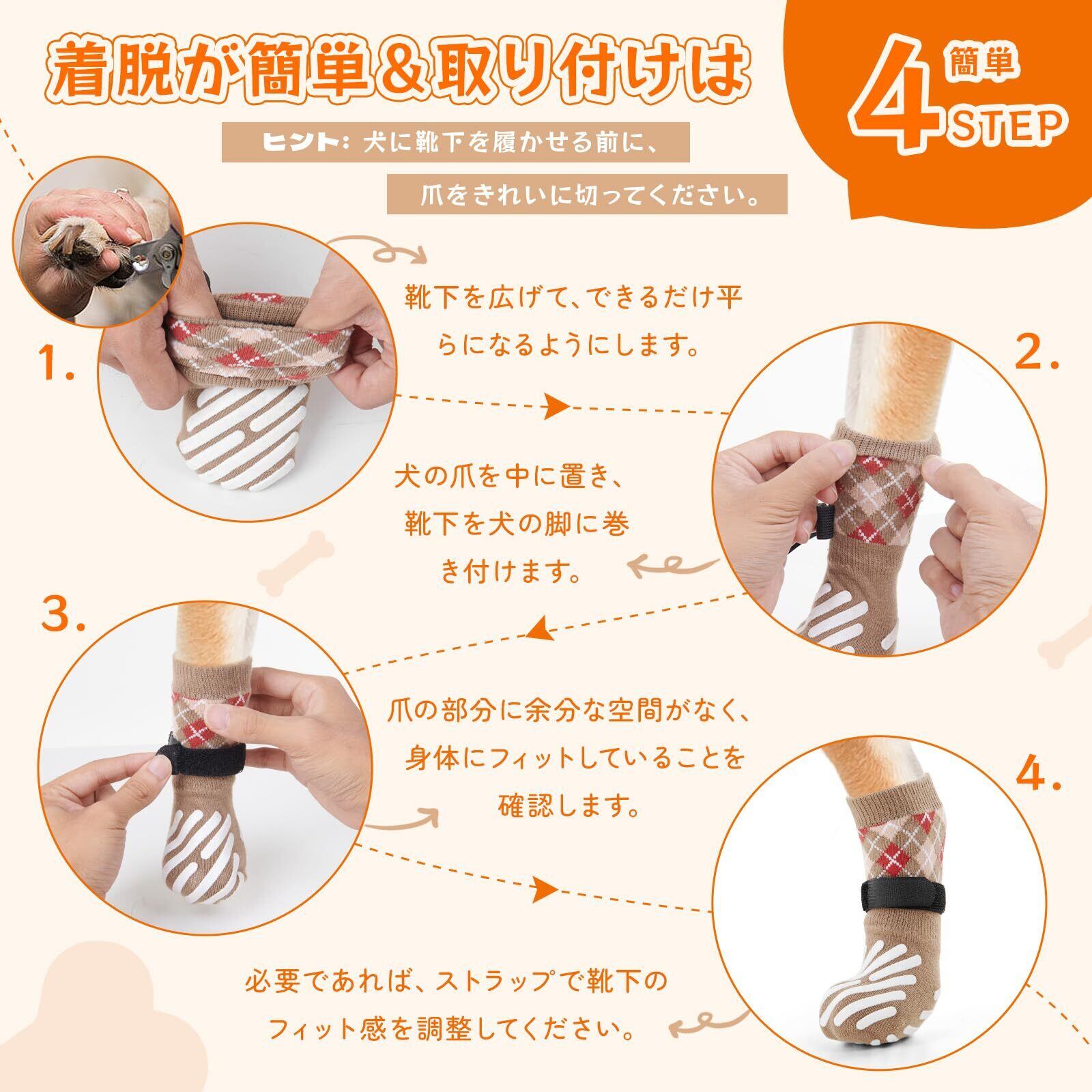 【着脱が簡単&洗濯機で丸洗い】 :L字型のデザインは、犬の足にしっかりとフィットし、快適な装着感を提供します。ほとんど違和感がなく、着脱も簡単です。犬の足裏は汗をかくため、汚れても安心して洗えます。犬の靴下 滑り止めは洗濯機で洗えるため、お手入れが簡単で、繰り返し使用できます。使い捨てる必要はありません。清潔に保ちやすく、未使用時には収納袋に保管することができます。