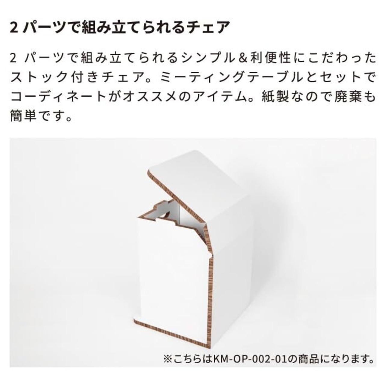 丈夫な紙資材「リボード」で作られている組立式のチェアです。機能的で利便性を高めたスタンダードな商品となります。上品な木目調の印刷を施しています。・シンプルと利便性にこだわったストック付きチェア。イベントや一時的な場所でのご使用に最適です。・ストック部分は仕切りがないので、例えばカバンや保管しておきたいモノをを入れるスペースとして、幅広くご使用できます。・2パーツで簡単に組み立て可能。工具不要。・紙資材ですが耐久性にすぐれ丈夫です。紙資材なので軽くてレイアウト変更や移動も容易です。またご不要になった場合は廃棄が手軽です。段ボール・古紙回収として処理が可能。(※お住まいの地域、自治体の従ってください。)・資材:リボード(丈夫な紙資材) 厚み16t。※紙素材で出来ています。お取り扱いにはご注意ください。※水の掛かる場所、濡れている床面、火元の近くでのご使用はお控えください。