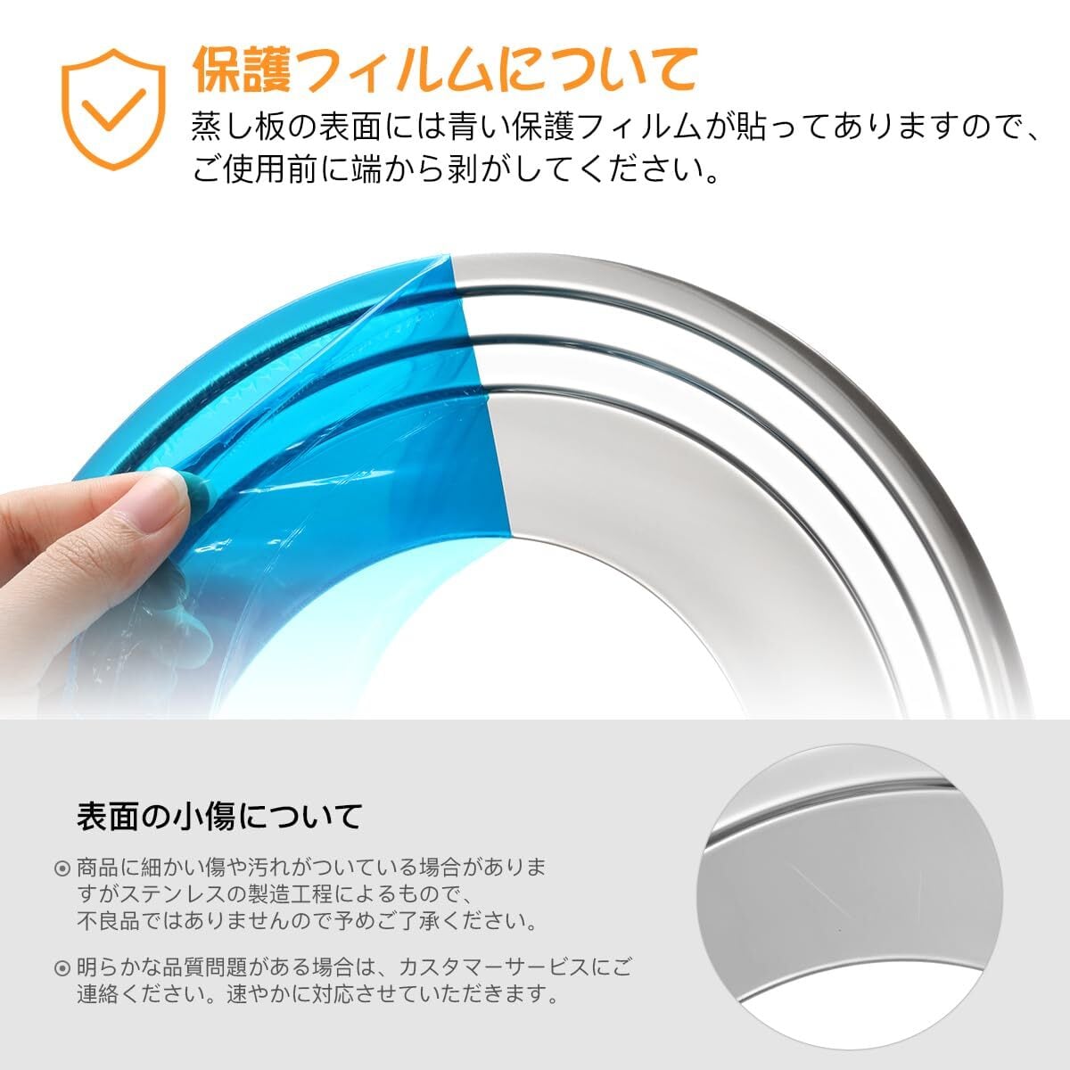 【3段階段】せいろ 受け台は階段状のデザインで、直径20-24-27cmの鍋に対応しており、適用範囲が広がります。ストックポット、中華鍋、フライパン、ミルクパン、電気調理器、キャセロールなどさまざまなタイプの鍋に適応します。(※蒸し板の表面には青い保護フィルムが貼ってありますので、ご使用前に端から剥がしてください。)