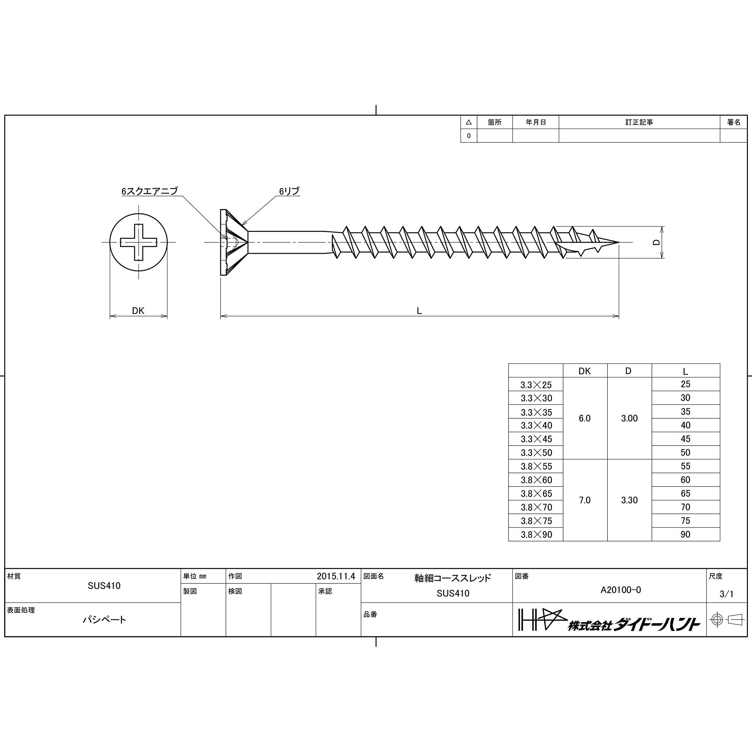 ダイドーハント (DAIDOHANT) ステンレス 軸細 コーススレッド (呼び径d) 3.3 x (長さL) 50mm (フレキ / 半ネジ ) [ SUS410 ] (120本入) 10176972