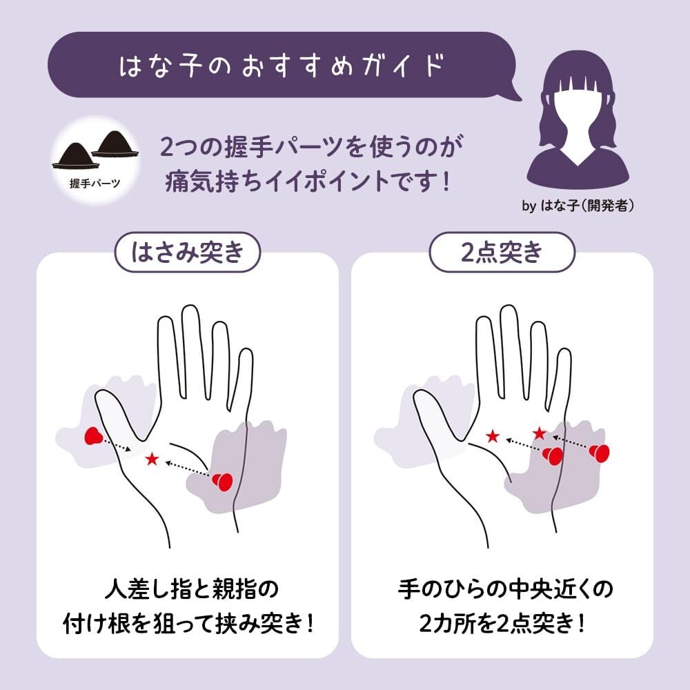 チョー強力 ダブル「握手パーツ」。ピンポイントでぐーっと押し込み「握手パーツ」が2個付属。2ヵ所を同時に突く「2点突き」や、ポイントを上下ではさむ「はさみ突き」を楽しめて、最高の痛きもちイイを実現します。