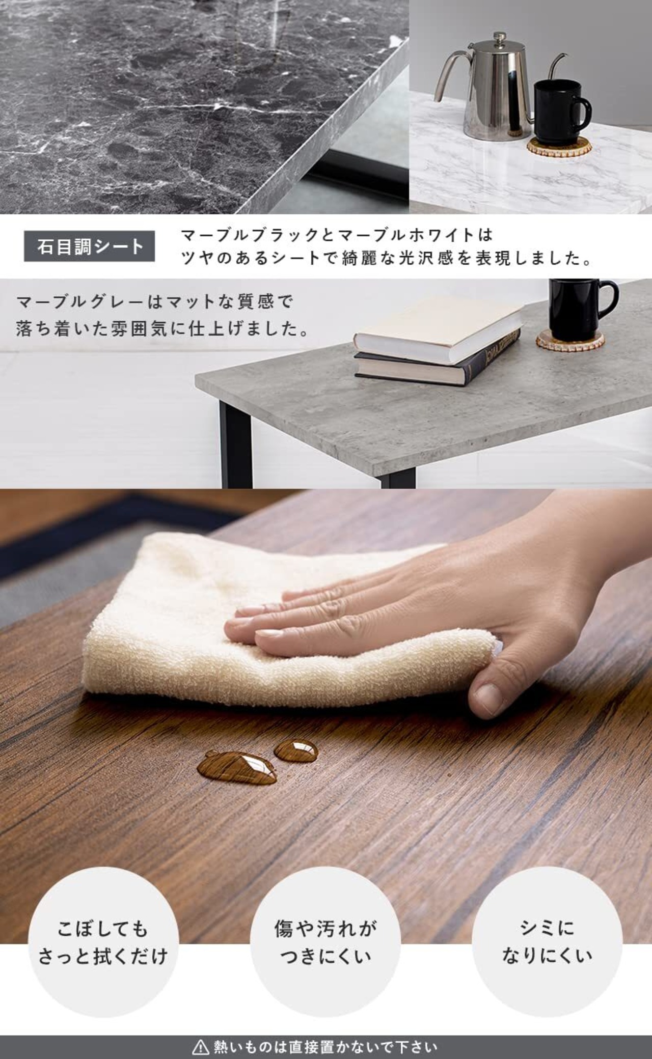 【異素材の組合わせでデザイン性UP】:リアルで本物に近い大理石調シート張りの天板と耐久性に優れたスチール脚がインテリアとしての存在感を発揮。