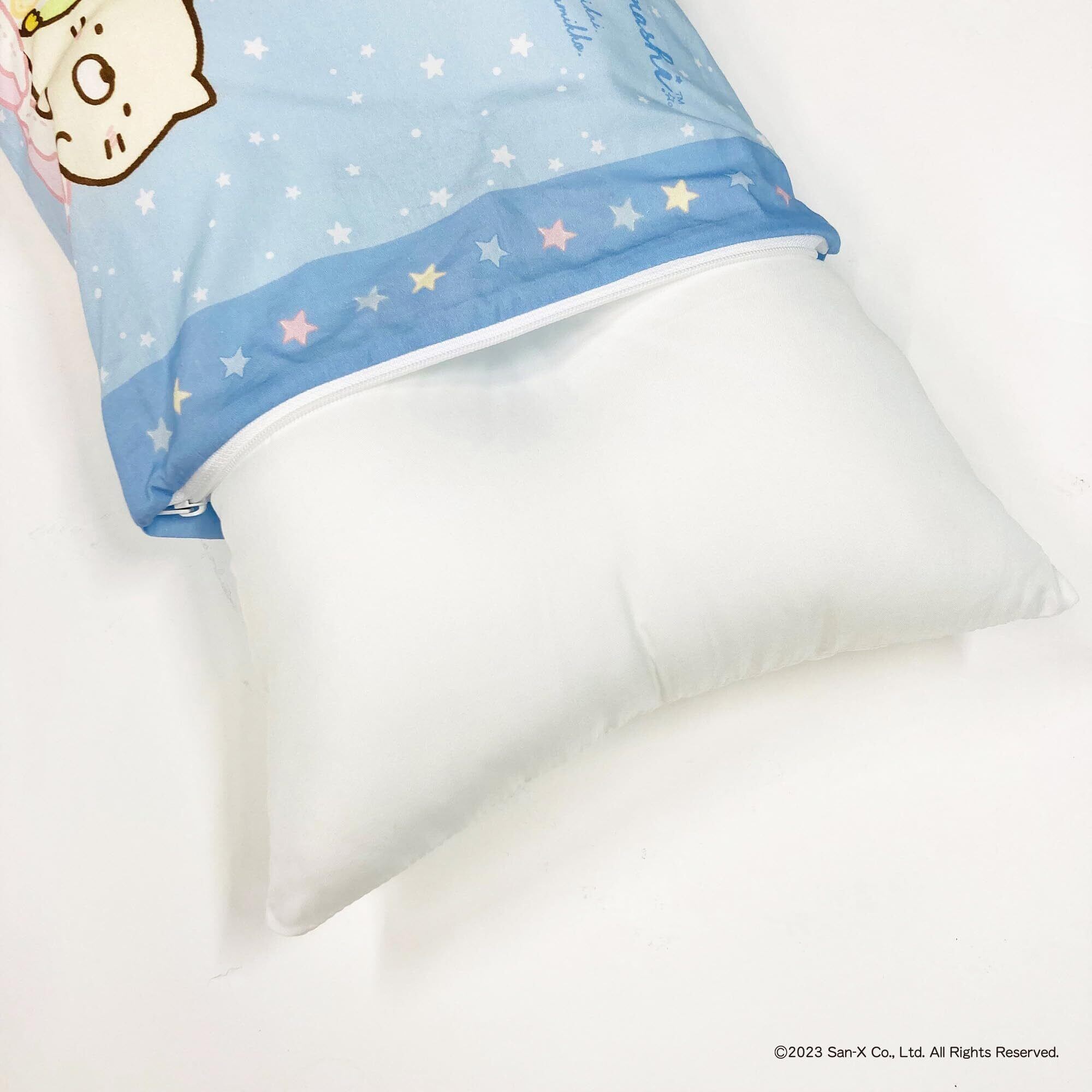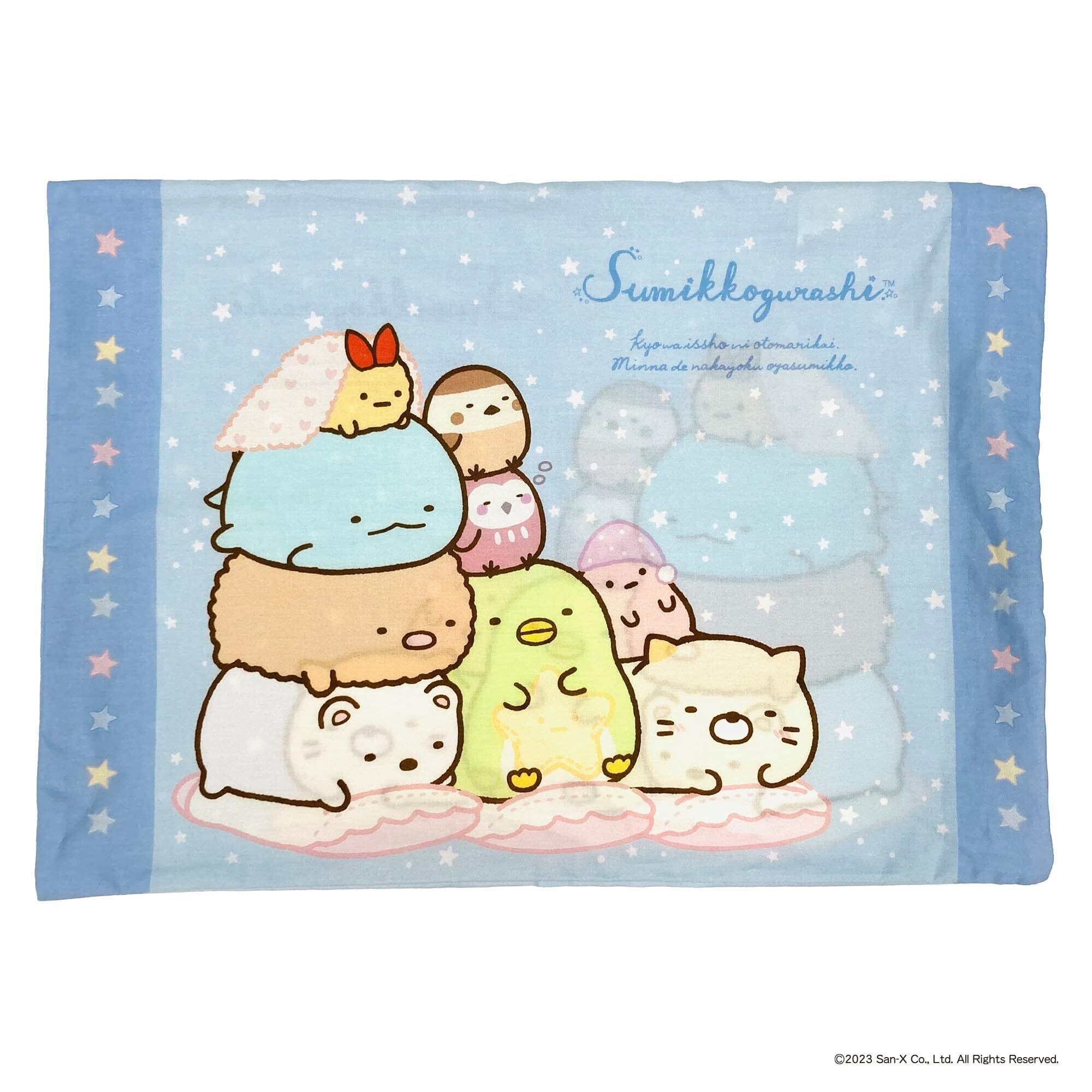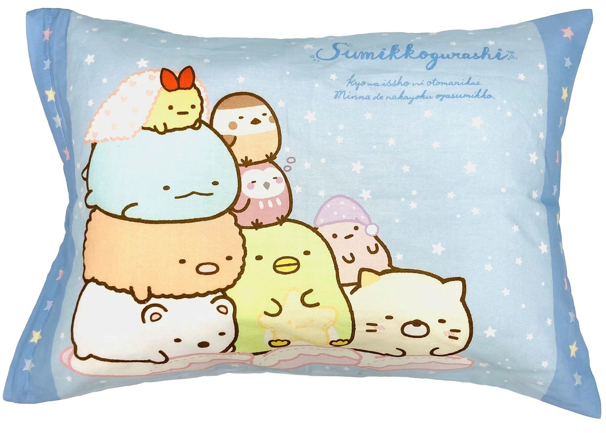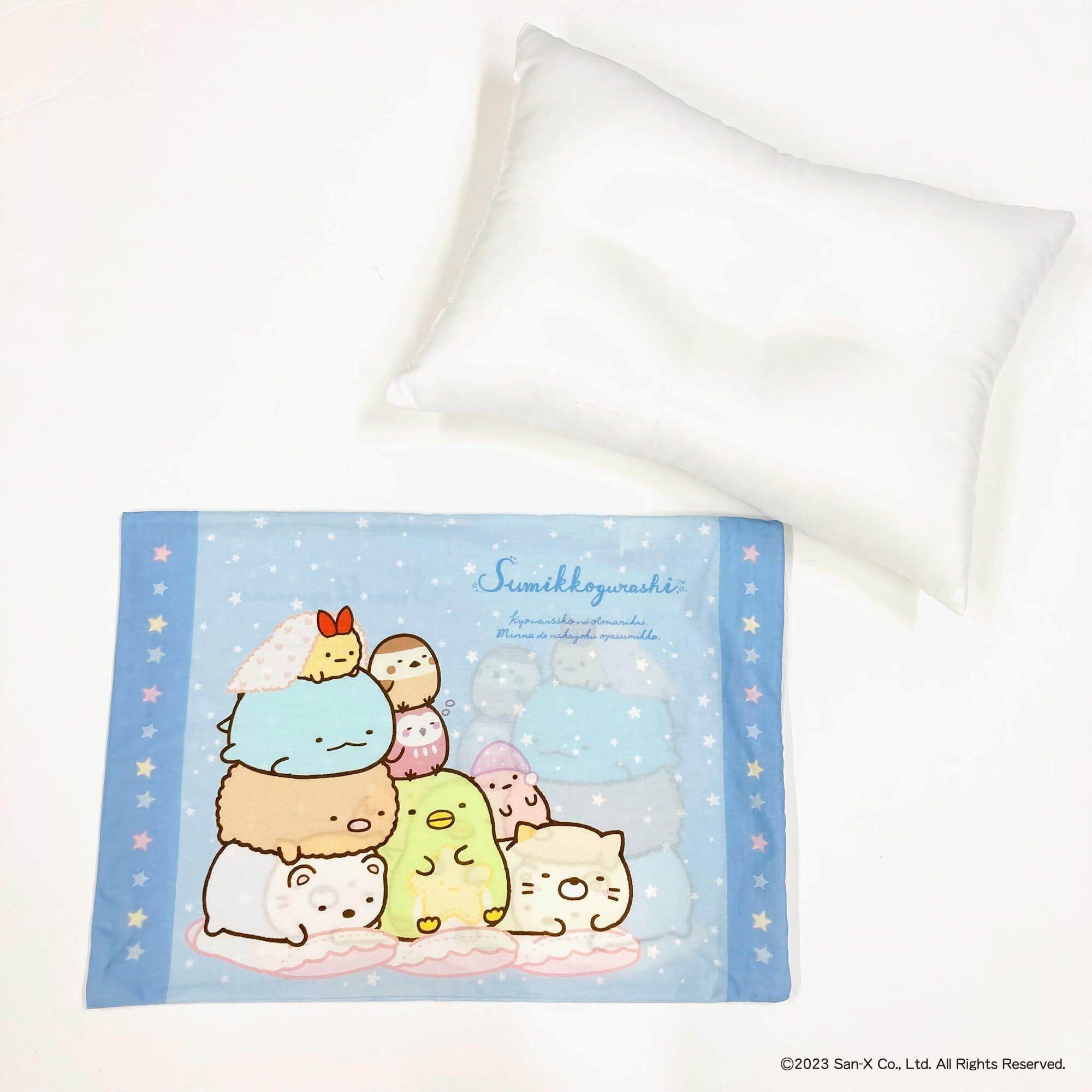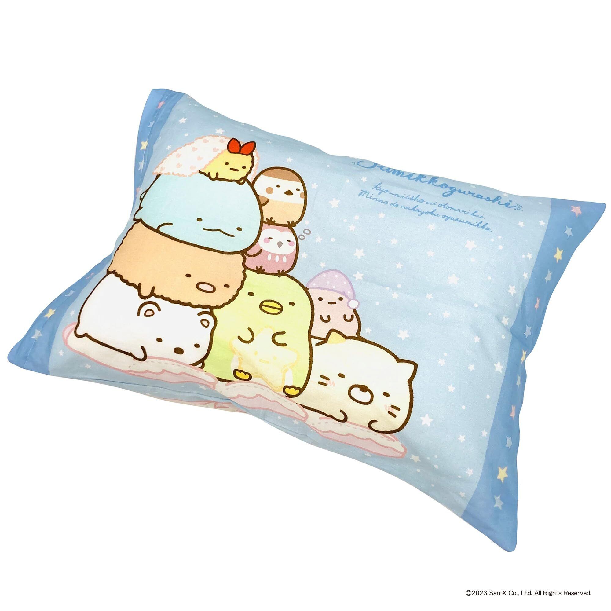 MORIPiLO サンエックス 子供 枕 (すみっコぐらし お泊り会 ジュニア枕) ぬいぐるみ グッズ クッション 約40x30x10cm ブルー 綿100 洗える カバー付き 可愛い 低め 小さめ 柔らかめ とかげ しろくま ねこ キャラクター まくらのモリシタ