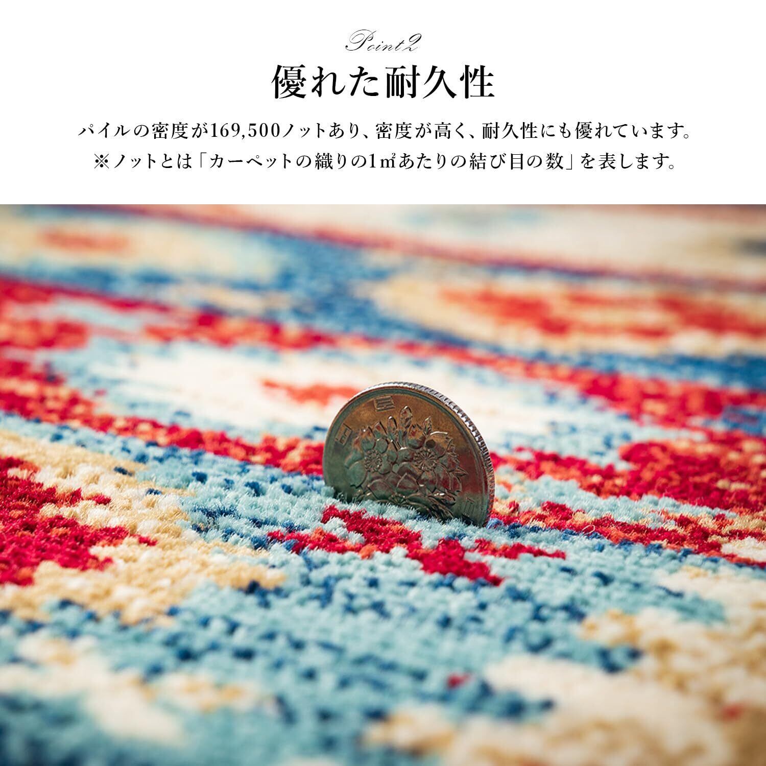 【ウィルトン織りとは?】ウィルトン織りは非常に耐久性の高い織物です。 家の中でも靴を履いて生活するヨーロッパで、土足で扱うことを前提として作られておりますので、長時間踏みつけてもヘタリにくく、弾力性もあり長くご使用頂けます。
