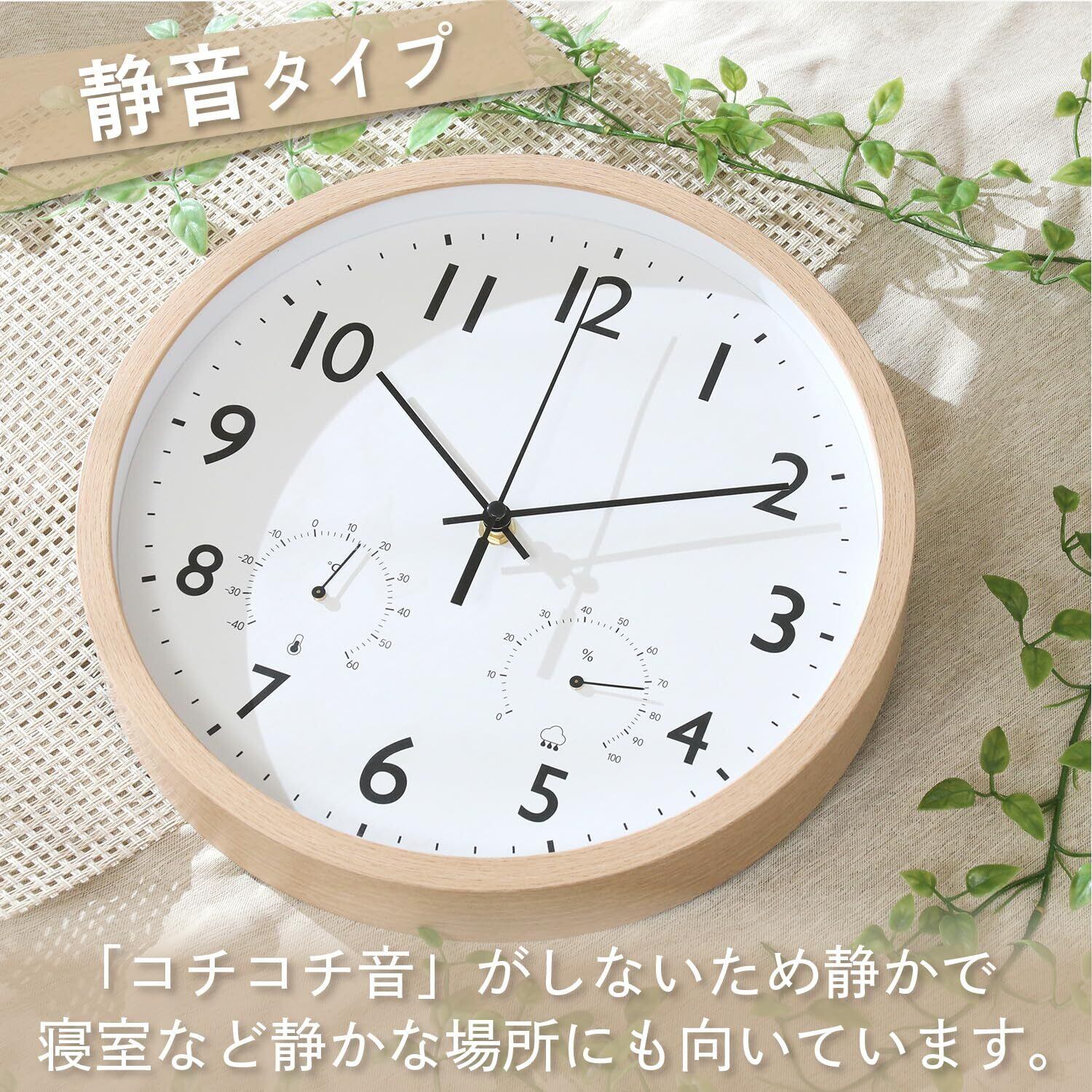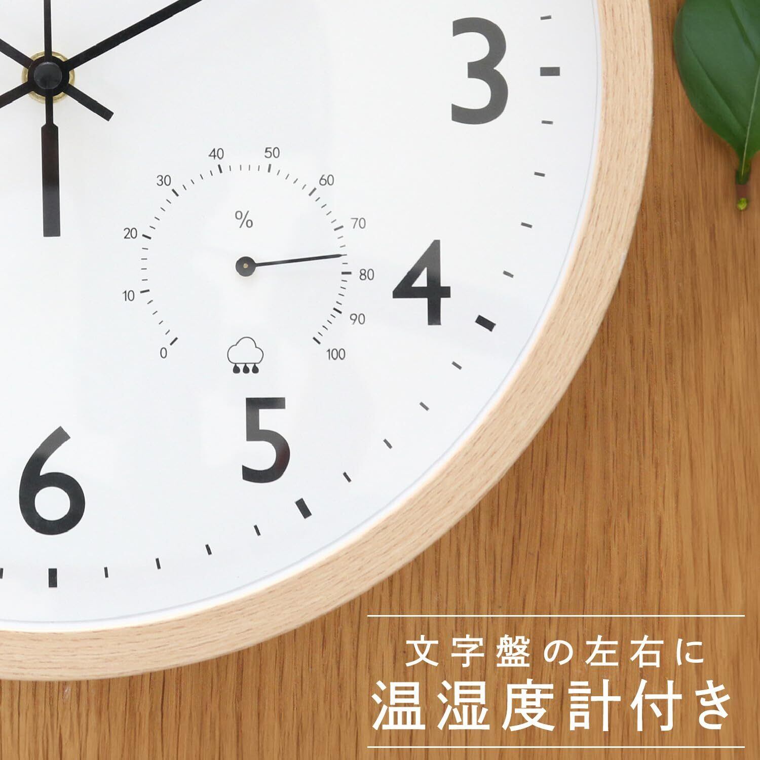 不二貿易 掛時計 温湿度計付 直径30cm 幅30×奥行4.5×高さ30cm ナチュラル 木製 スイープ 連続秒針 静音 フォレスト 19076