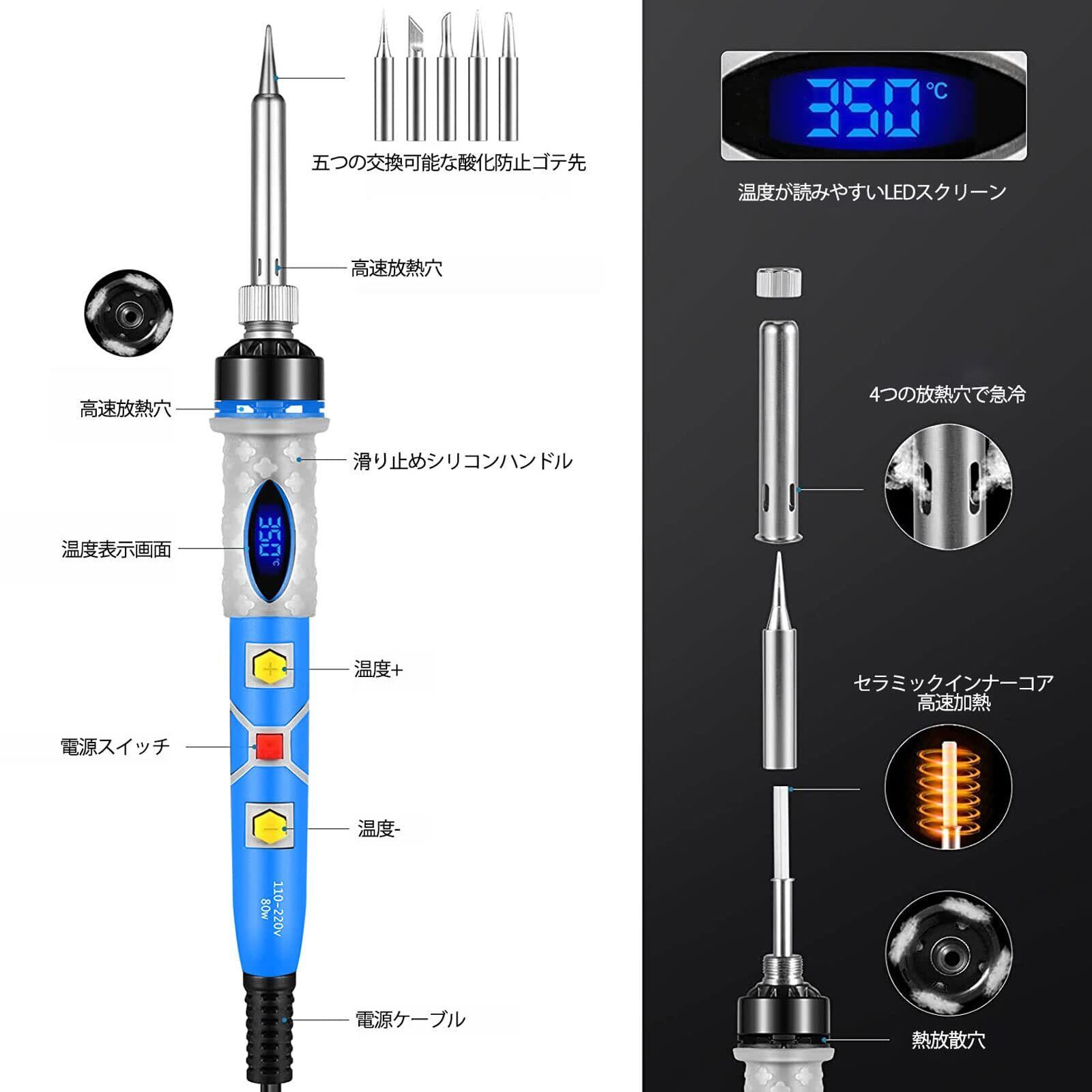 KLARYTYMA ハンダゴテ はんだごてセット200-450℃ 調温ボタンを備えたはんだこて80W八ンダゴテキットゴテ先(5本)付き 溶接ツ-ル はんだワイャ一、スタンド、溶接および修理用のはんだこてスタンド