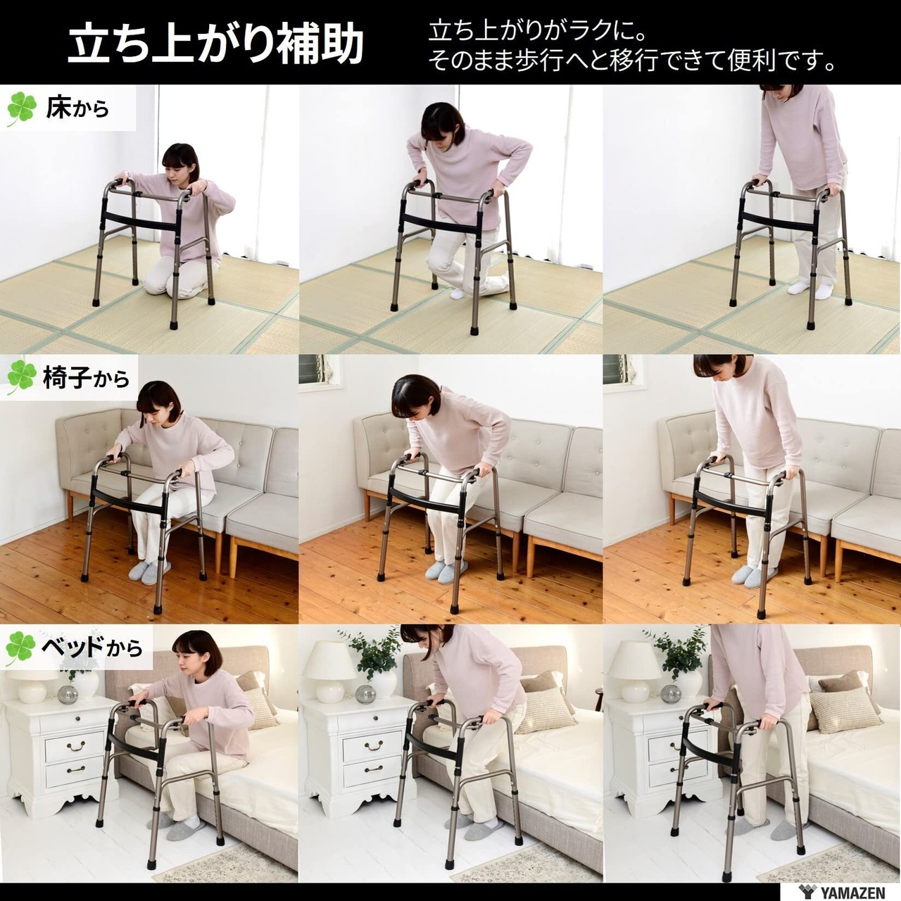 【固定式歩行と立ち上がり補助】固定式歩行は持ち上げる力が必要ですが、安定した歩行補助ができます。床や椅子、ベッドからの立ち上がりも補助することができ、これ1台で立ち上がりから歩行までの動作をスムーズにサポートします。