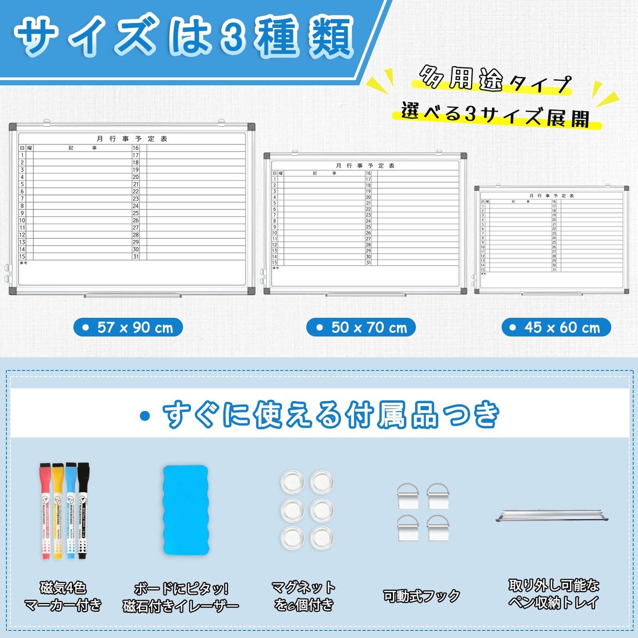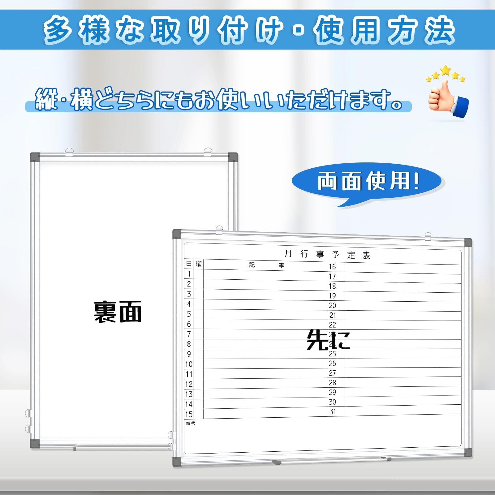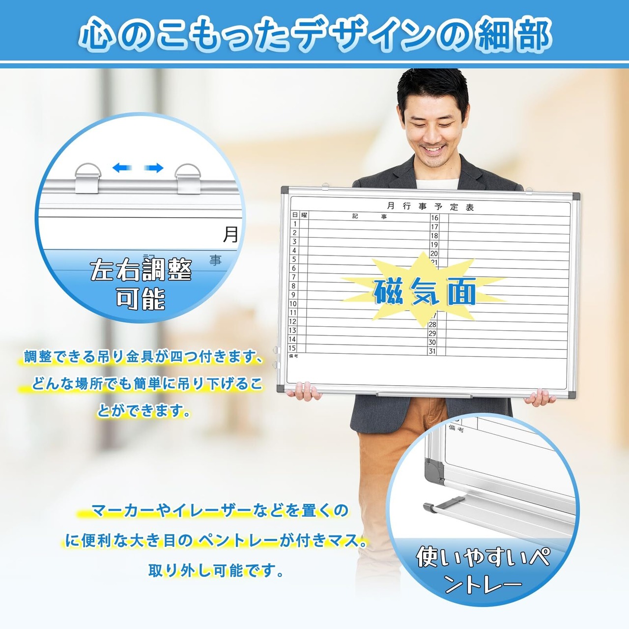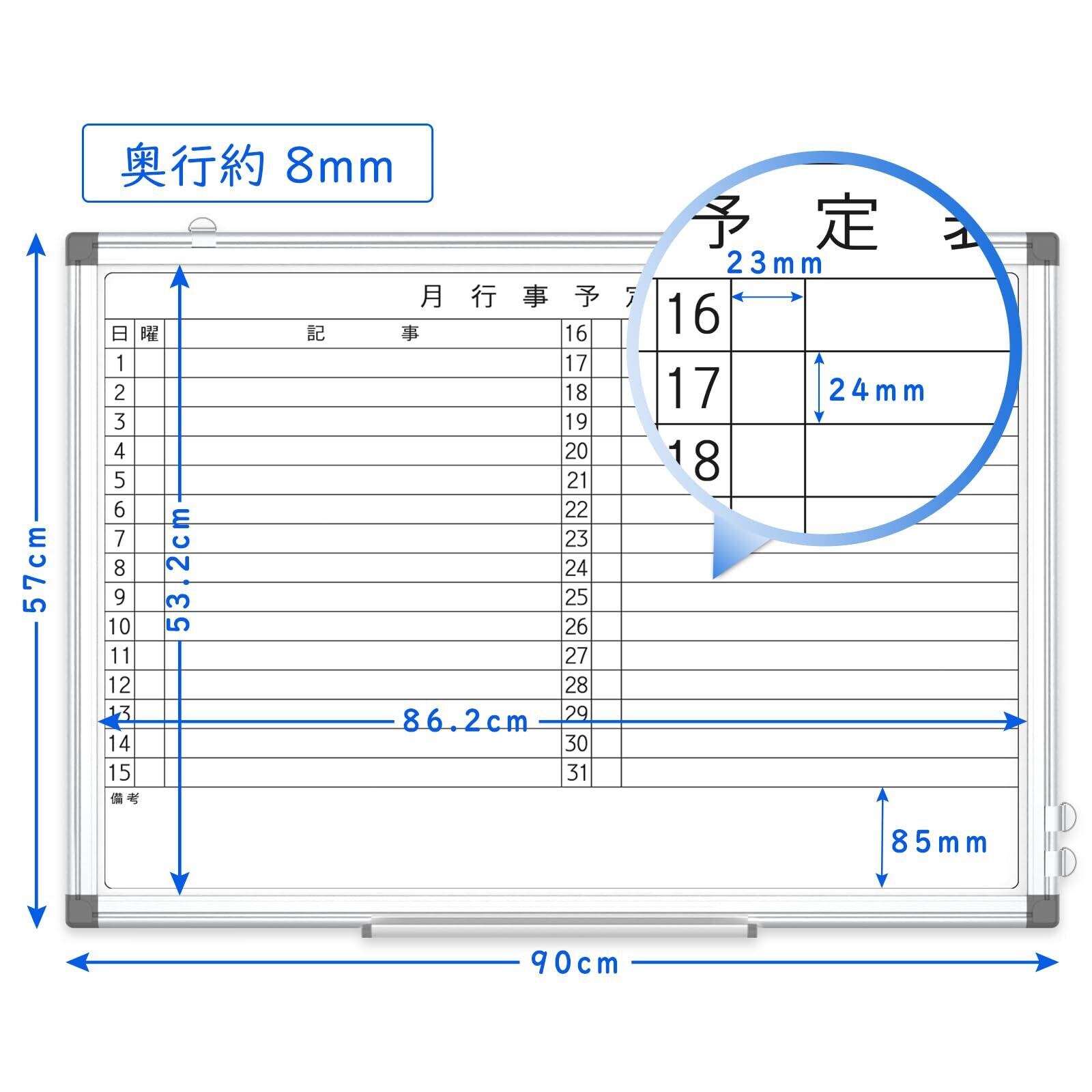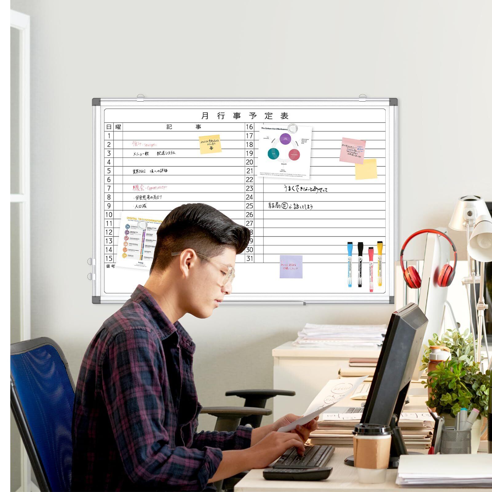 【在庫処分】Walspax ホワイトボード 月予定表 壁掛 90x57cm マグネット ホワイトボード 罫線 月間予定表 行動予定表 ボード 両面使用 縦横兼用 アルミフレーム スケジュール帳 お支度ボード スケジュールボード ホワイトボード カレンダー おしゃれ 備考 家庭用 オフィス用品 マーカー・イレイザー付き