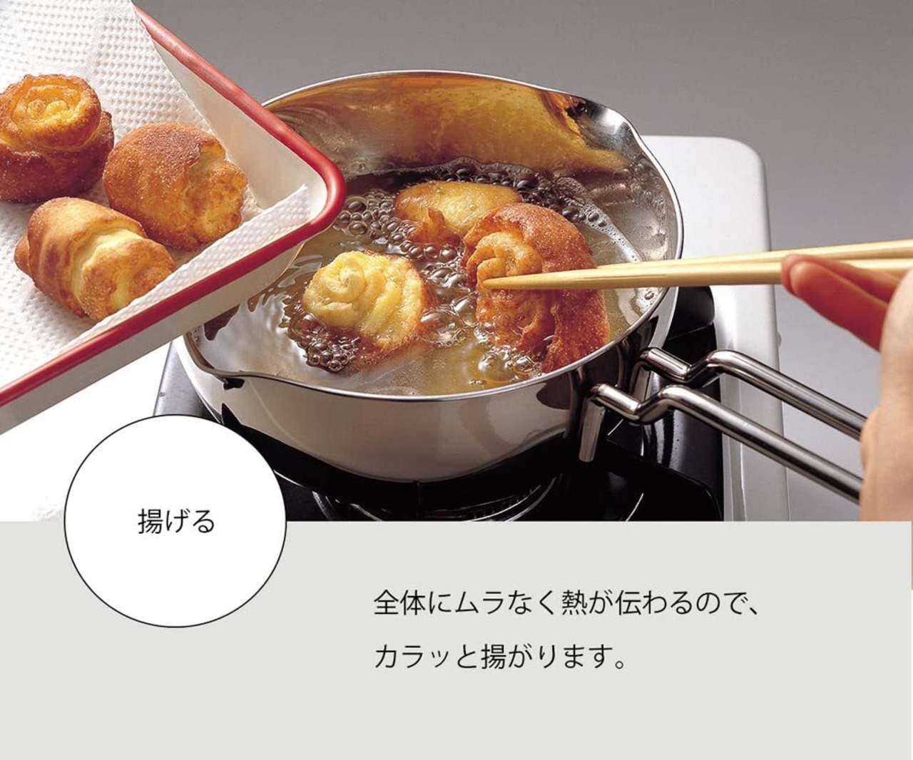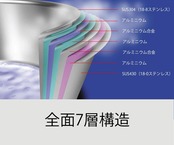 鍋製品の材質は、熱伝導性の高いアルミニウムをステンレスで挟んだ全面7層構造。鍋ごとオーブンで使用することもできるし、鍋そのものをオーブンのように使って、ケーキを作ることもできるほど高性能だ。ハンドルもステンレスなので「熱くなるのでは」と不安に感じる向きもあるかもしれないが、この部分が握れないほど熱ければ火力が強すぎる目安になるというから、よく考えられている。