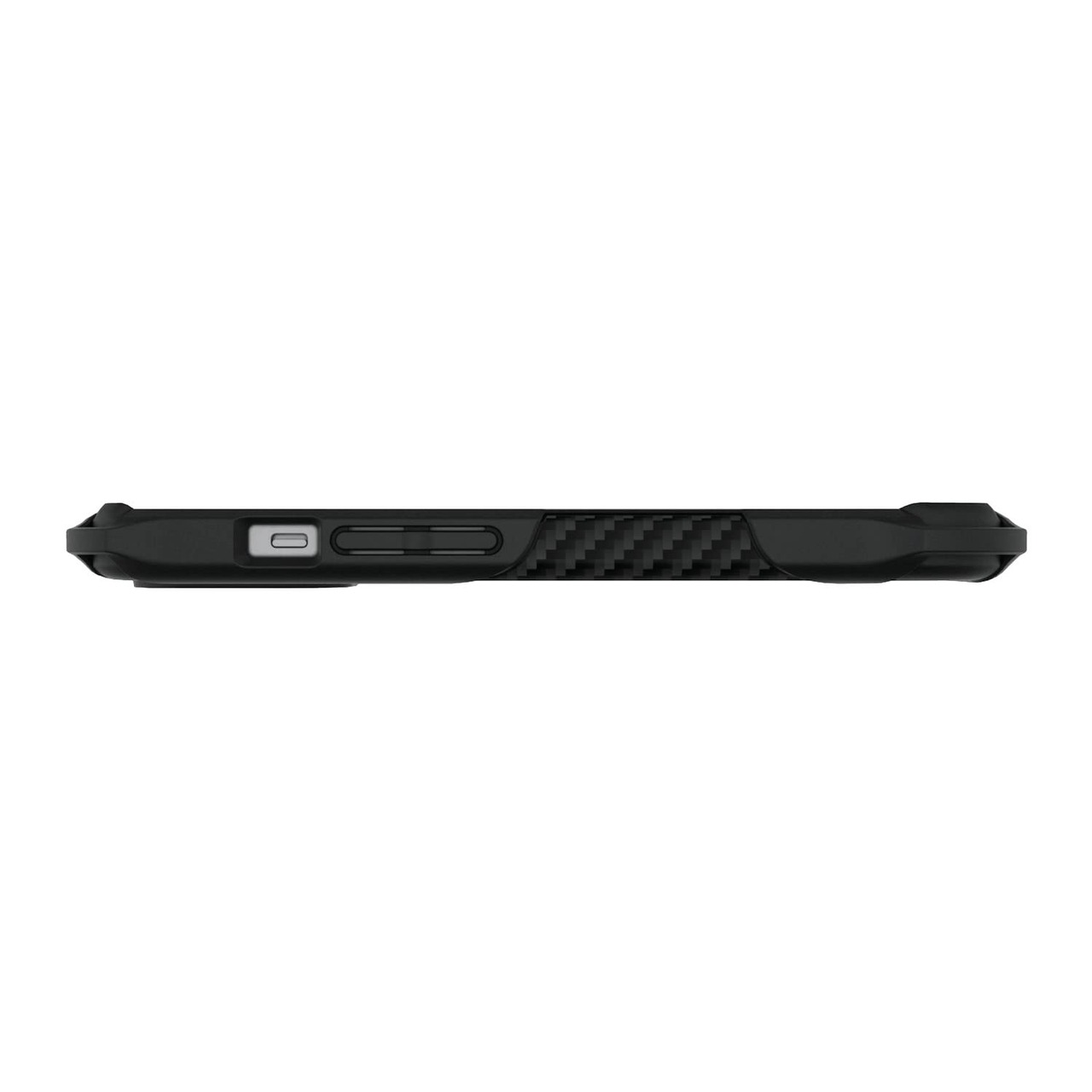 ケース背面から側面にかけてカーボン調のグリップテクスチャを施すことで、滑りにくくし持ちやすさを向上しています。