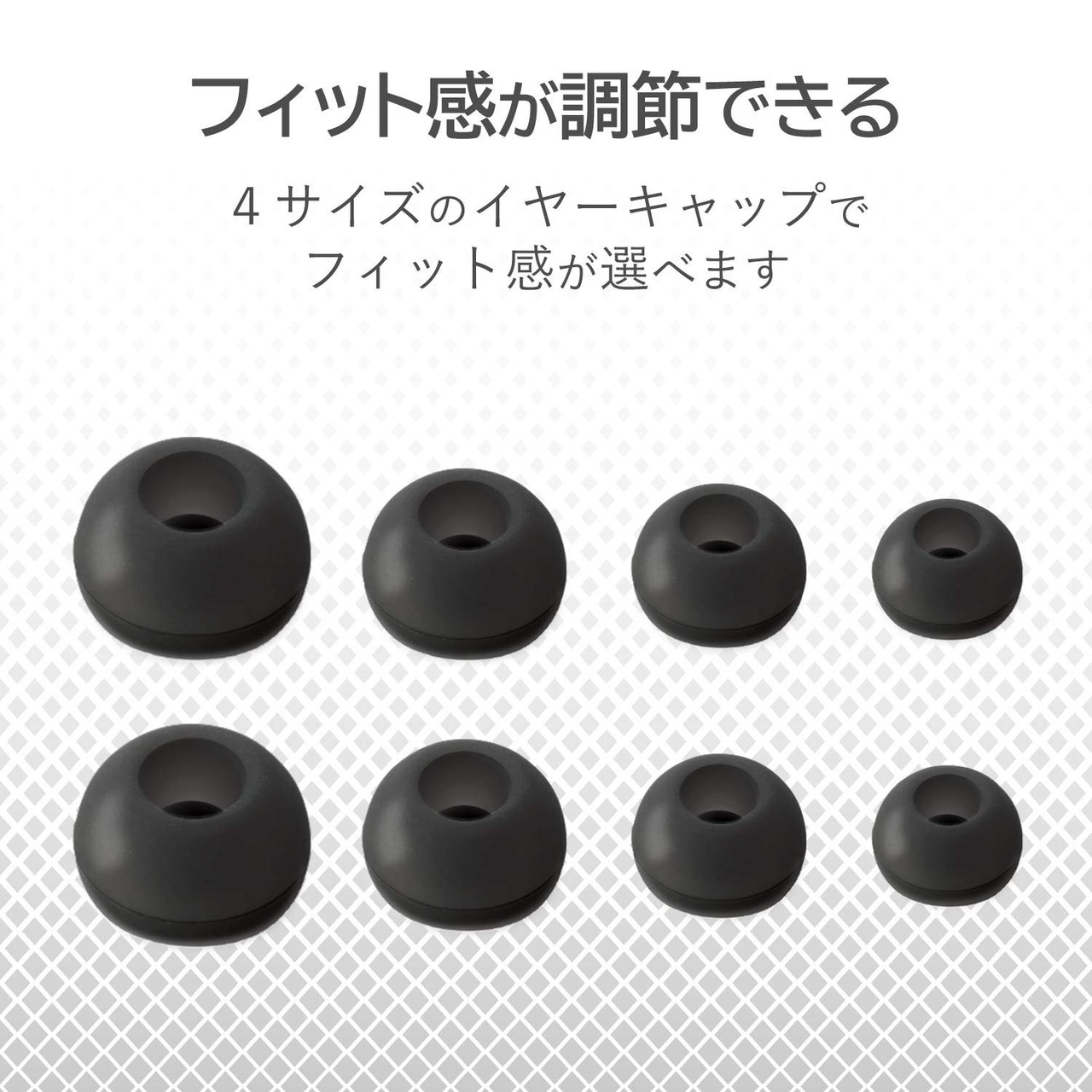 フィット感が選べるようにイヤーキャップが付属。一般的なS・M・Lサイズに、さらに小さなXSサイズを加えた4サイズが付属しています。