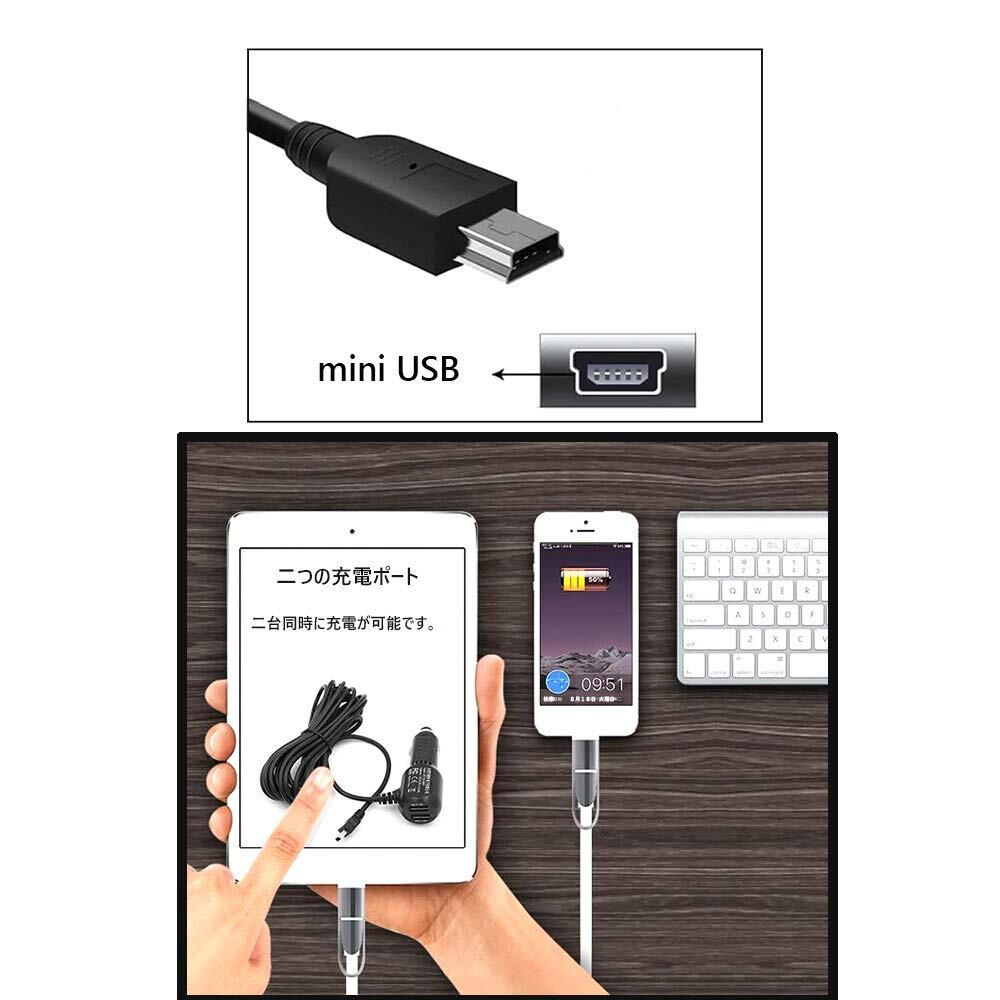【新春セール】YFFSFDC シガーソケット充電器 シガー電源ケーブル ドライブレコーダー用電源ケーブル 2.4A+1A 12V/24V 二つのUSBポート miniUSB ドライブレコーダー/GPS/タブレット/車載冷蔵庫/スマホなどに対応