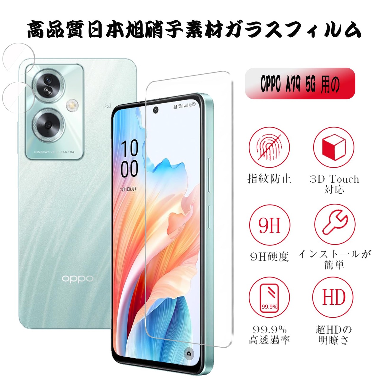【2+2枚セット】OPPO A79 5G 用のガラスフィルム(2枚)+カメラフィルム(2枚)OPPO A79 用の フイルム 強化液晶保護フィルム ワンタッチ貼付け/気泡ゼロ/ケースと干渉せず/硬度9H/飛散防止/指紋防止