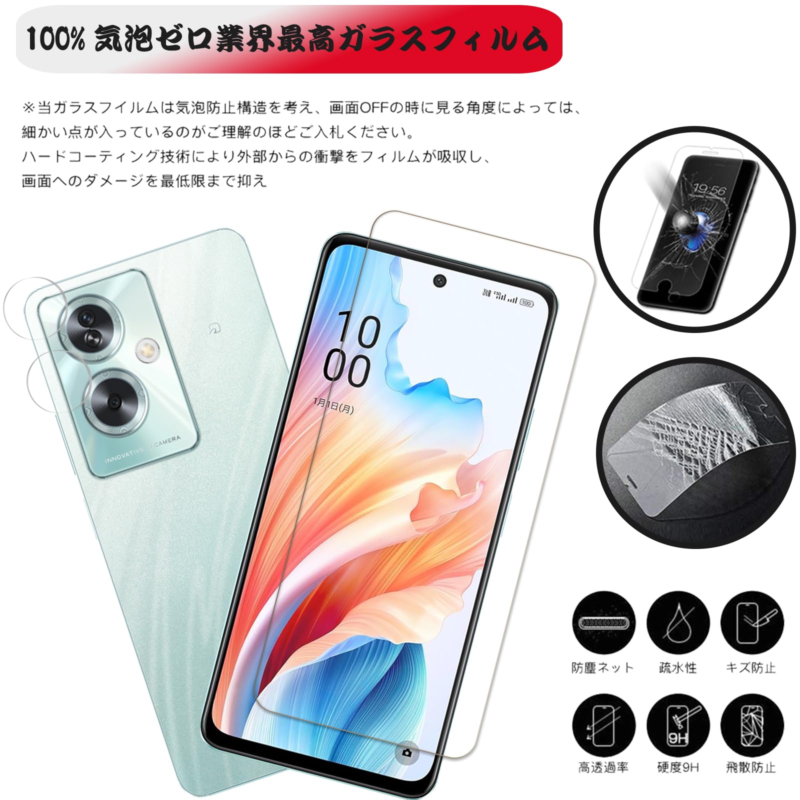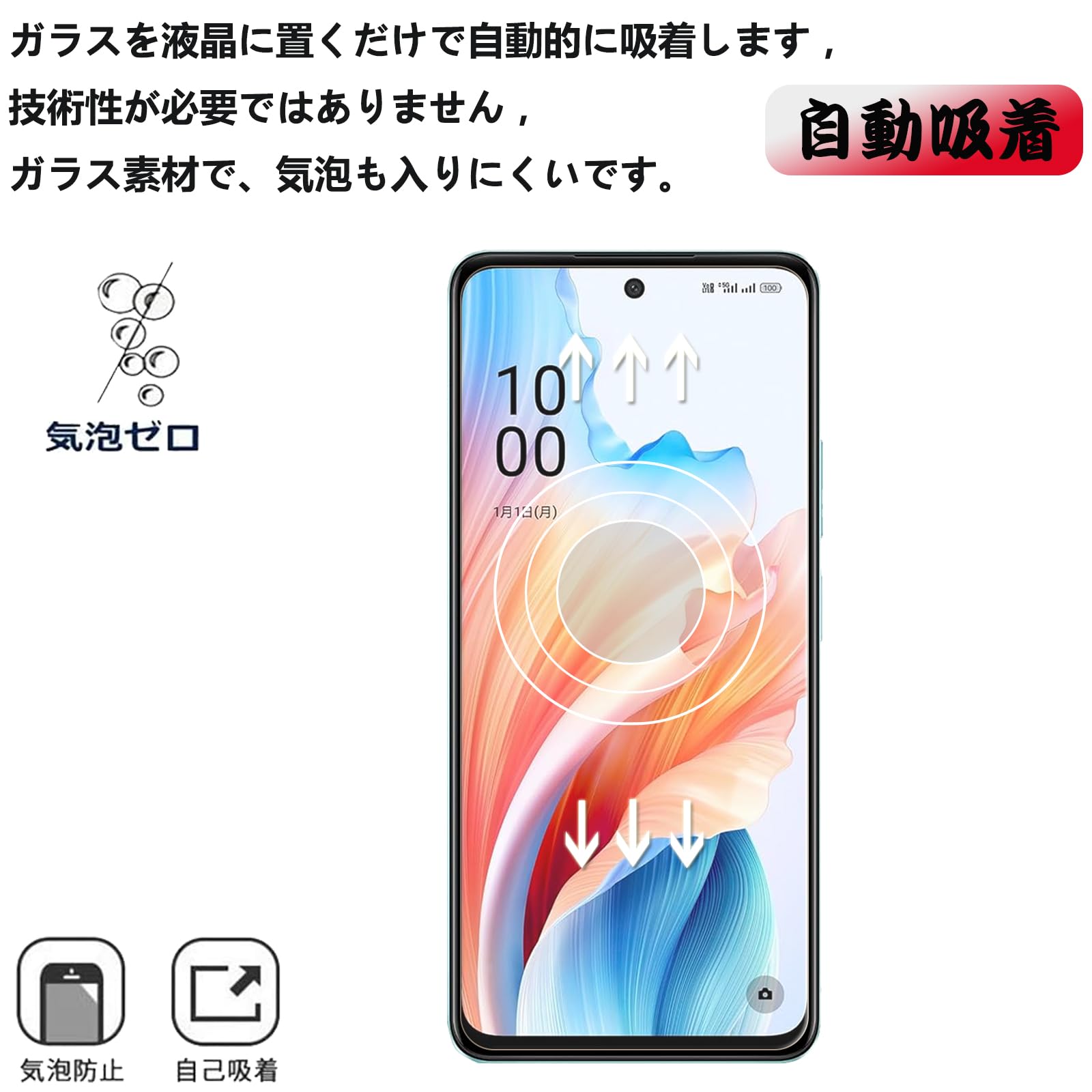 【OPPO A79 5G 用の】ラウンドエッジ加工を採用しており、透過率が高いガラスを採用しているため、フィルムを装着しても液晶画面の美しさはそのまま維持することが出来ます。【気泡無しと簡単貼り付け】丁寧に加工したので、気泡が入りにくくて、4つ簡単な手順のみで誰でも簡単に貼り付けることができます。自己吸着できるシリコン粘着シートで、簡単的に貼り付けます。ガラスを液晶に置くだけで自然に吸着、簡単に気泡が抜いて行くので、誰でも簡単、綺麗に貼ることができます。