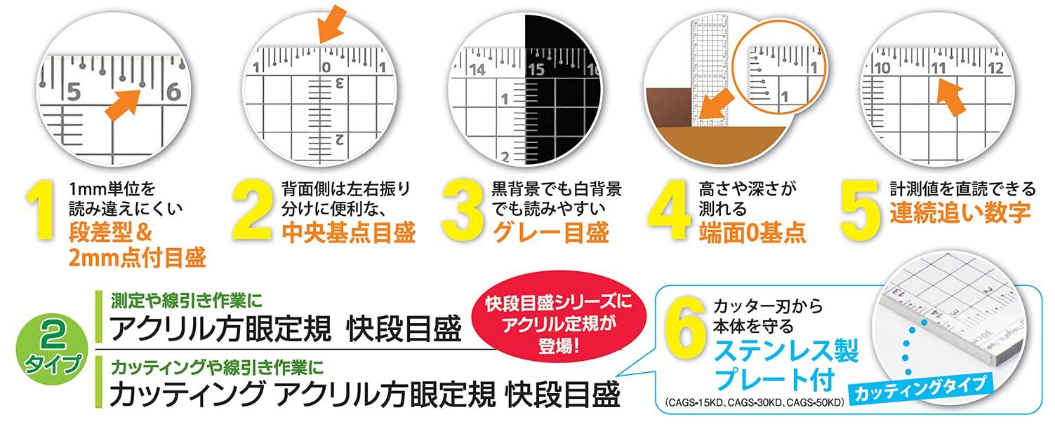 新潟精機 SK 日本製 アクリル方眼定規 快段目盛 カッティングプレート付 15cm CAGS-15KD