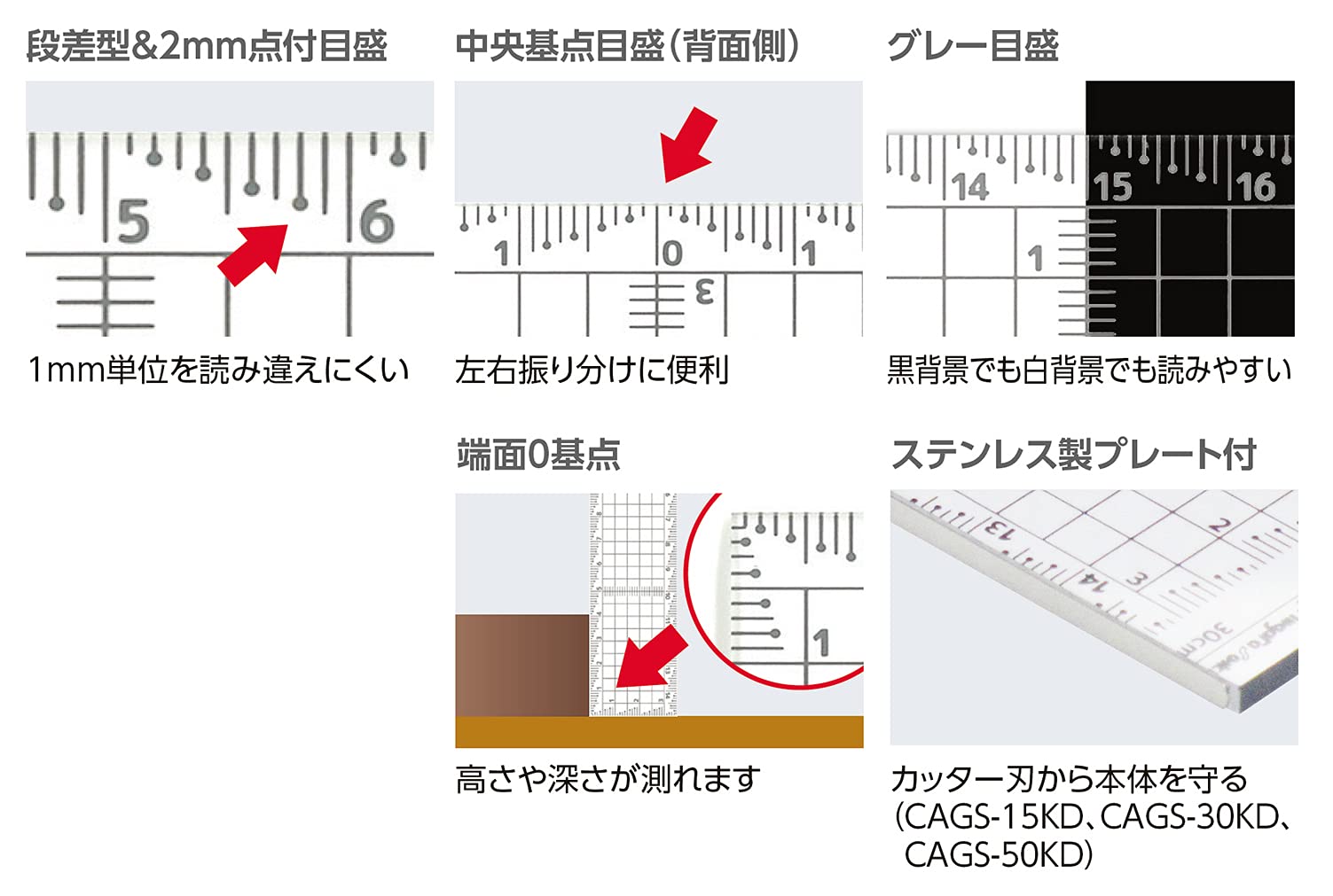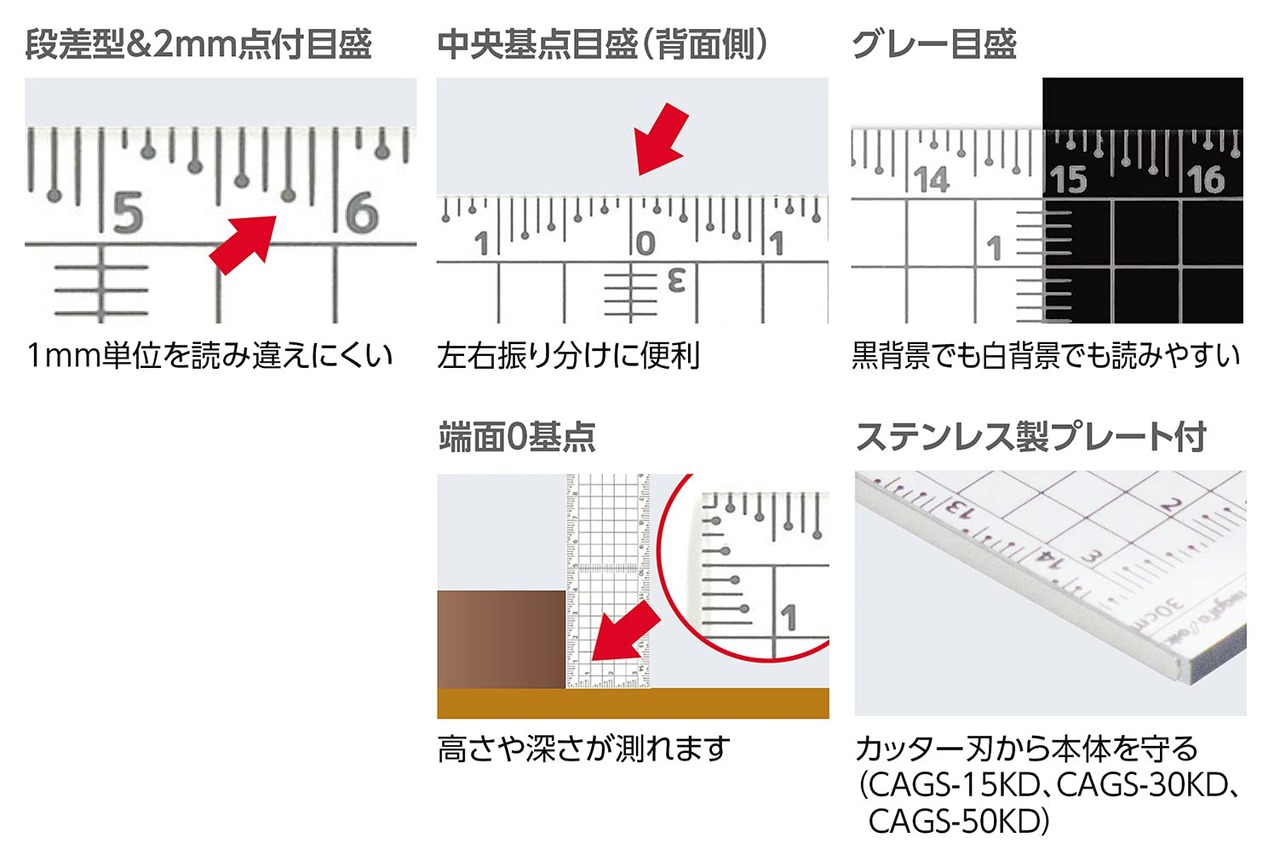 1mm単位を読み違えしにくい段差型&2mm点付目盛です。
