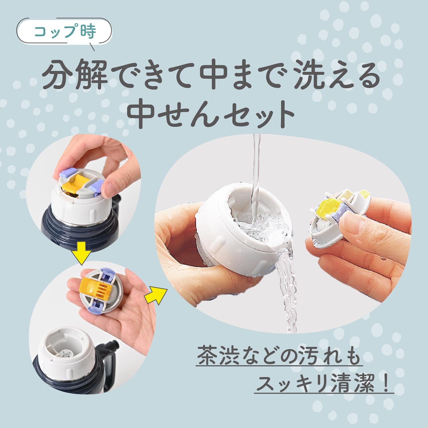素材・材質:本体/ステンレス (アクリル樹脂塗装)、保冷専用せんユニット・コップ・中せん・片・ストロー/ポリプロピレン、飲み口/シリコーンゴム、パッキン・底ゴム/シリコーンゴム