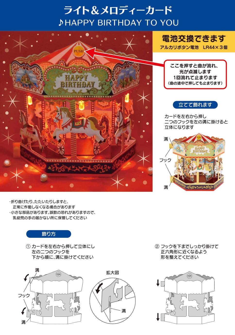 ・飾ったサイズ:13.5x15x12cm 立体ライト&メロディーカード ・カードを前後に開いてフックを掛けると、六角形の立体になり立てて飾れます。ボタンを押すと、「HAPPY BIRTHDAY TO YOU」の曲に合わせて、赤とオレンジ色の光が点滅し、ふんだんに施された金箔加工に反射して、とてもきれいです。カードの裏側にメッセージスペースがあります。光った静止画はイメージです。 ・電池交換できます。 ・郵便料金(国内)は140円です。海外にも郵送できます(海外にお送りする際は、郵便局で料金をお確かめください)。 ・© 2021 SANRIO CO., LTD.