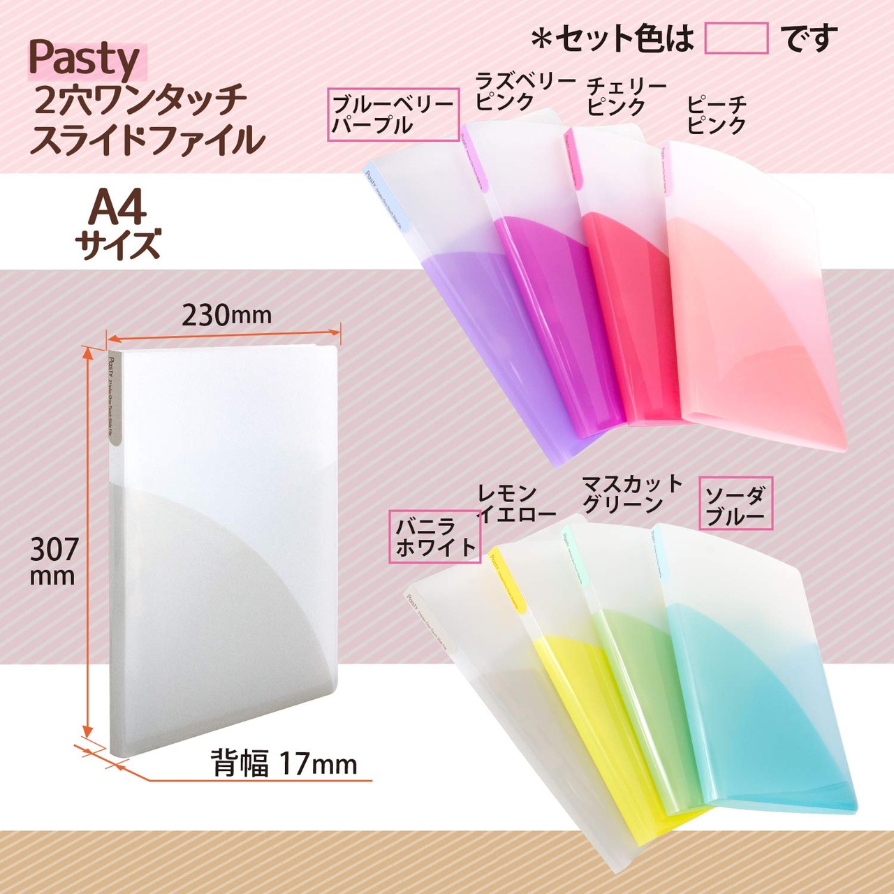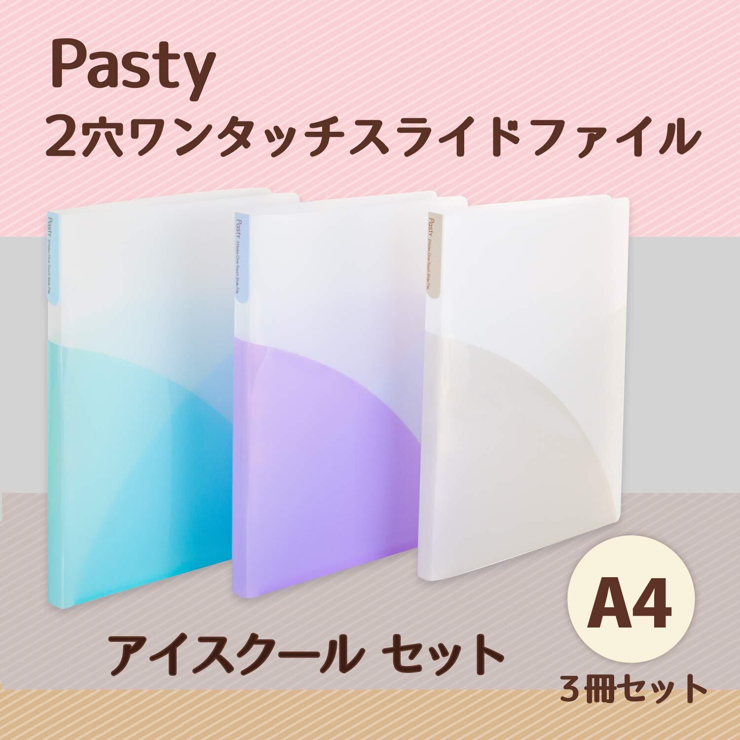 セット : ピンクジェラート3色セット / タイプ : 2穴ワンタッチスライドファイル / 穴数 : 2穴