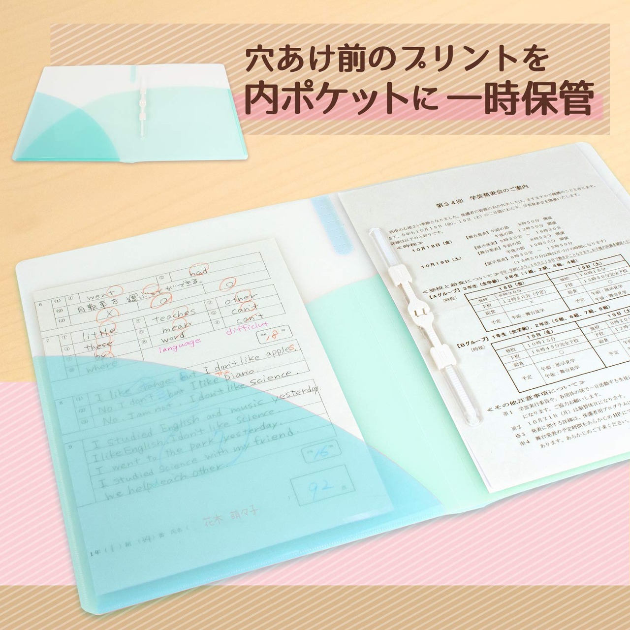 プリント保管に便利な内ポケット付き! とじ具の抜き差しがカンタンな新しい2穴ファイル