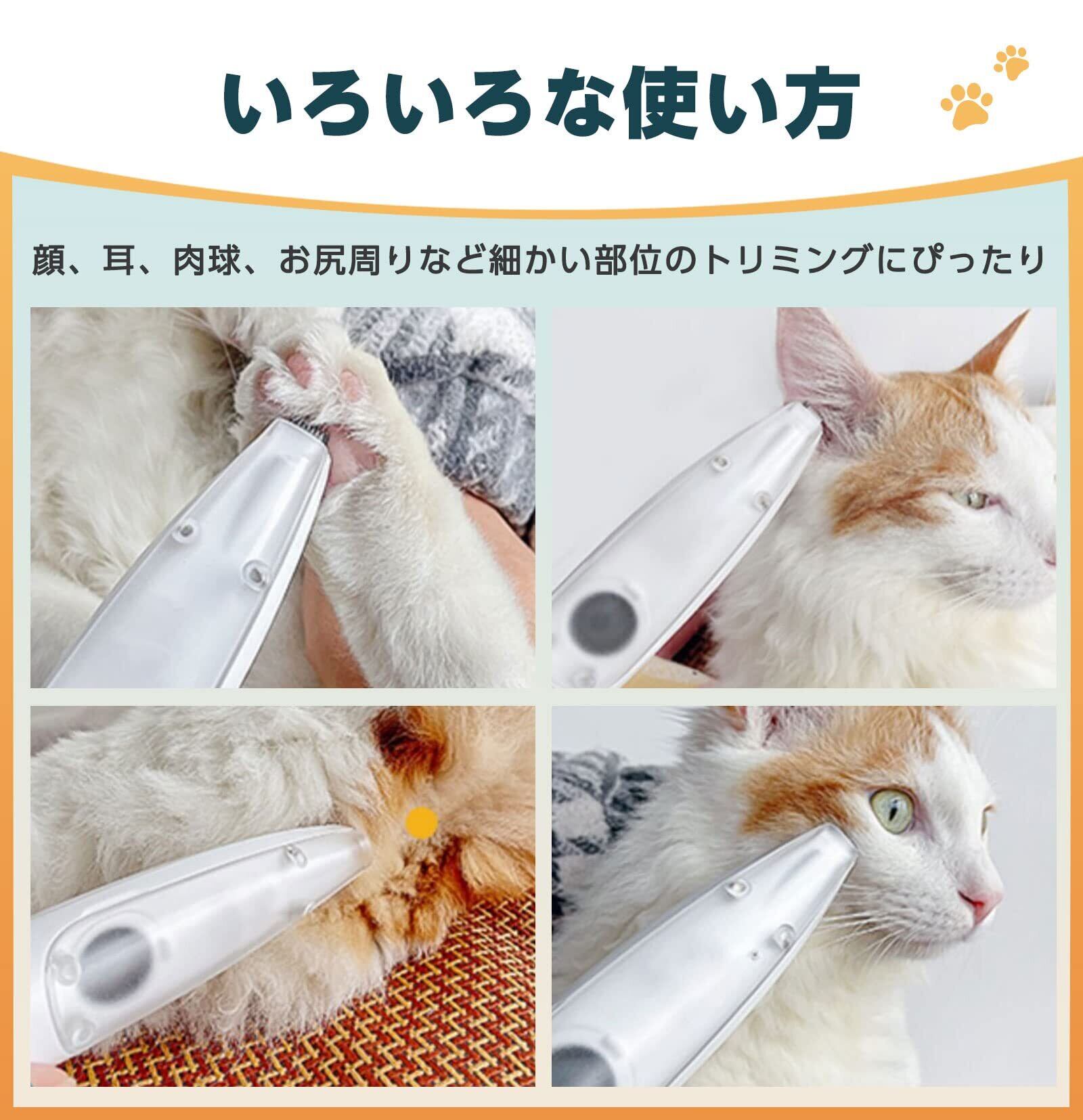 【2段階調整可能&LEDライト付き】バリカンを2段階調整できます。先端にLEDライトが付いており、耳、肉球、お尻周りなど見えにくい部位の状況を確認しながらトリミングできます。長く突出するように設計された刃部は、ペットさんの毛と十分に接触して、しっかりカットします。