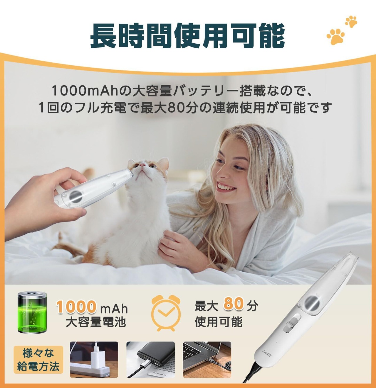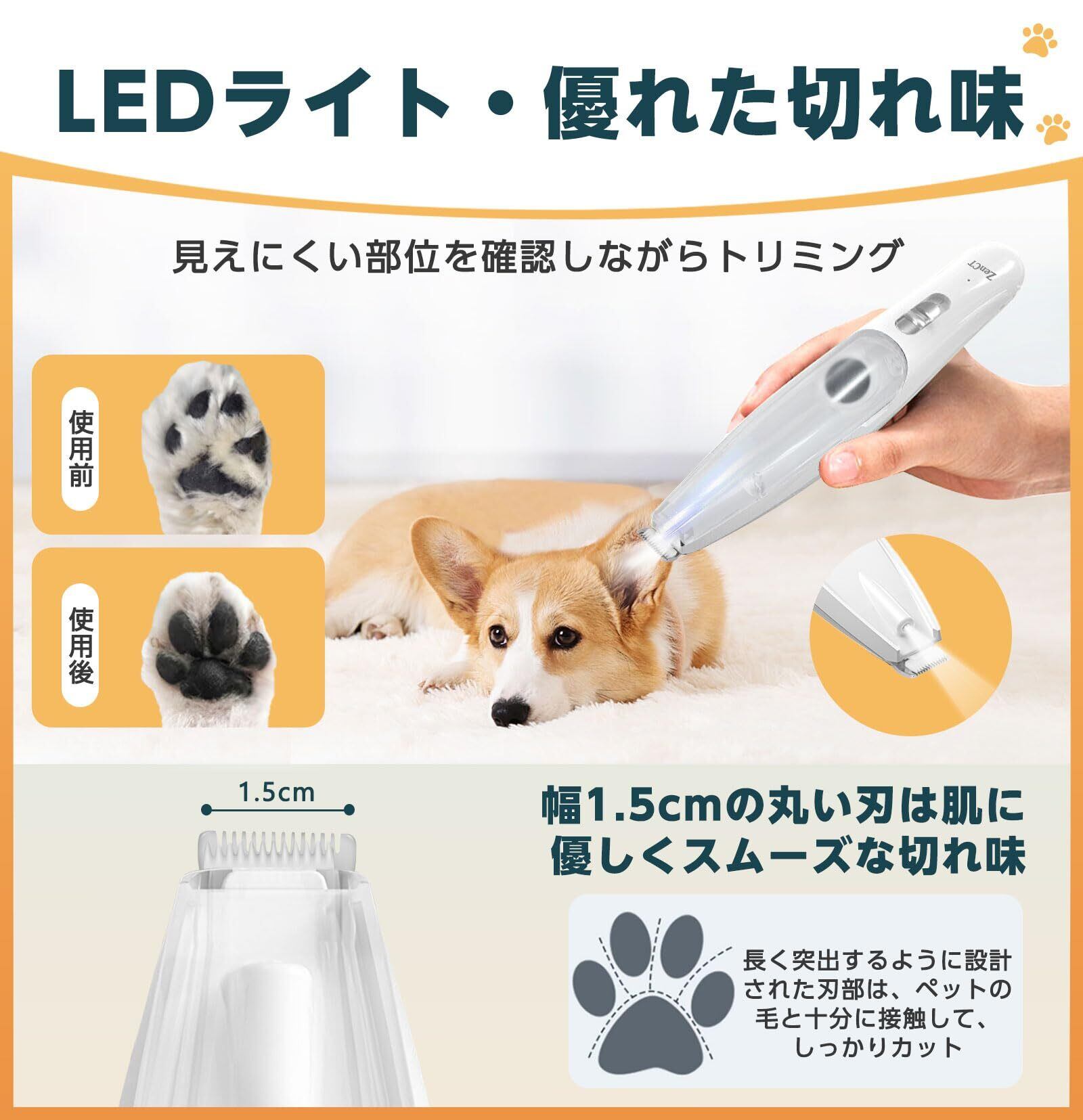 ZenCT ペット用バリカン 吸引式 犬用バリカン 充電式コードレス 部分カット 2段階調整可能 LEDライト付き 自宅トリミング ペット バリカン 犬 猫 足裏 耳裏 顔周り お尻周り 軽量 低騒音 CT210