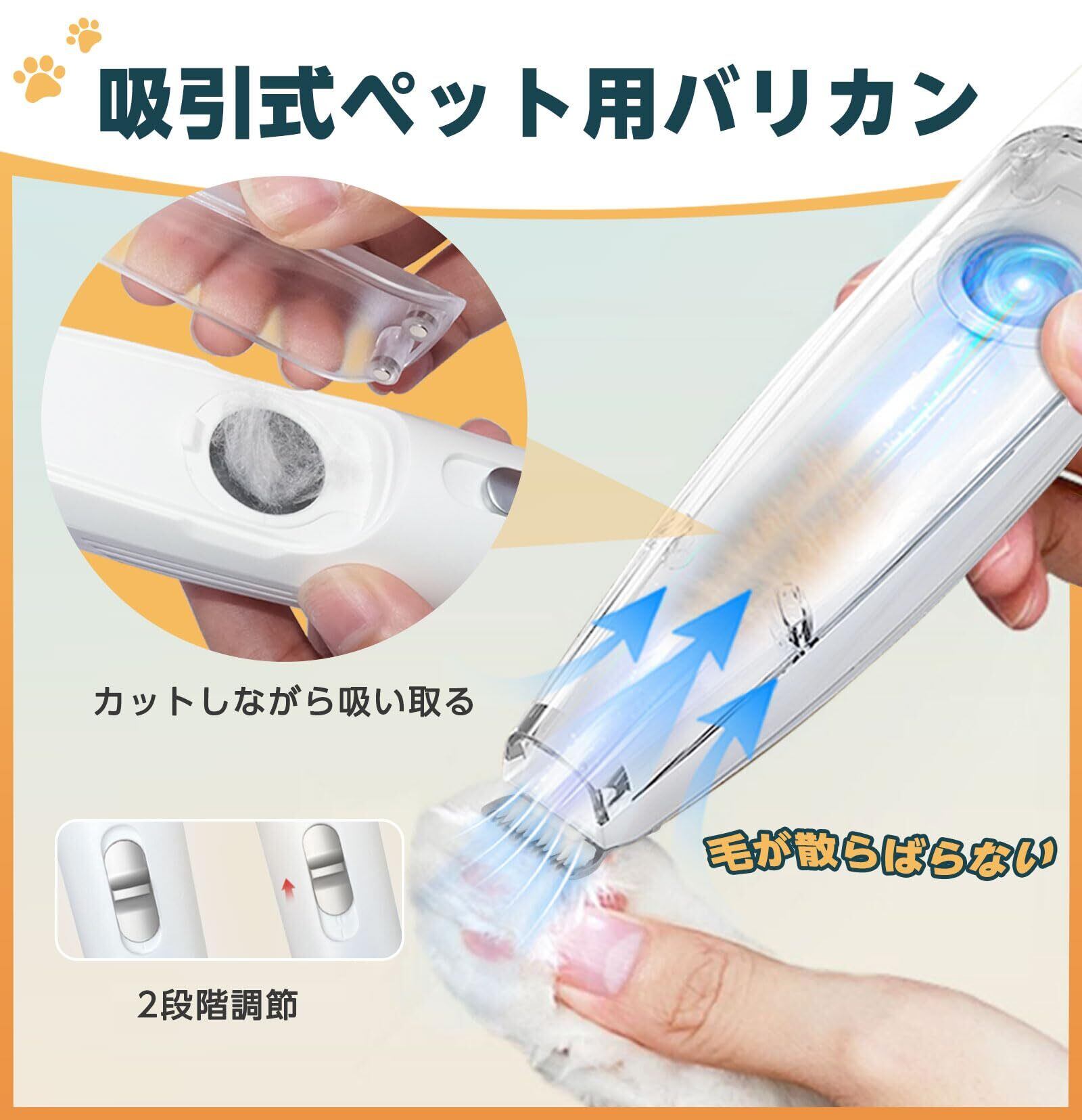 【吸引式ペット用バリカン】トリミングしながら吸い取ることができて周りに毛が飛び散らないように設計されたペット用バリカンです。良質なステンレススチールとセラミックで構成された刃と優れたなR面取り刃設計で、肝心の切れ味が良く、肌を傷つけることもなく、いつでも安心かつ快適にカットてきます。
