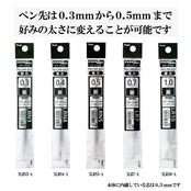 ボールペンの芯径は0.3、0.4、0.5、0.7、1.0mmと幅広く対応しているので、芯を用意すればお好みのサイズで書くことができる。(内蔵芯は0.5mm)