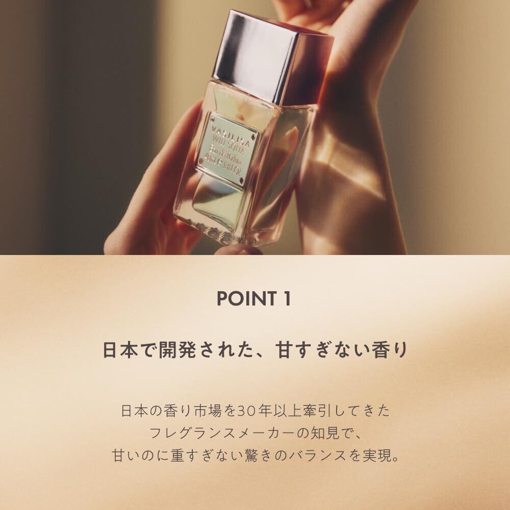 【Point:ポイント】爽やかで驚くようなグルマンの香り:①すべての香りにバニリンを配合* *香料に含む ②EDIBLE NOTE ”食べられる”ものをモチーフにしたキー香料 ③日本人に合う、重すぎない香り