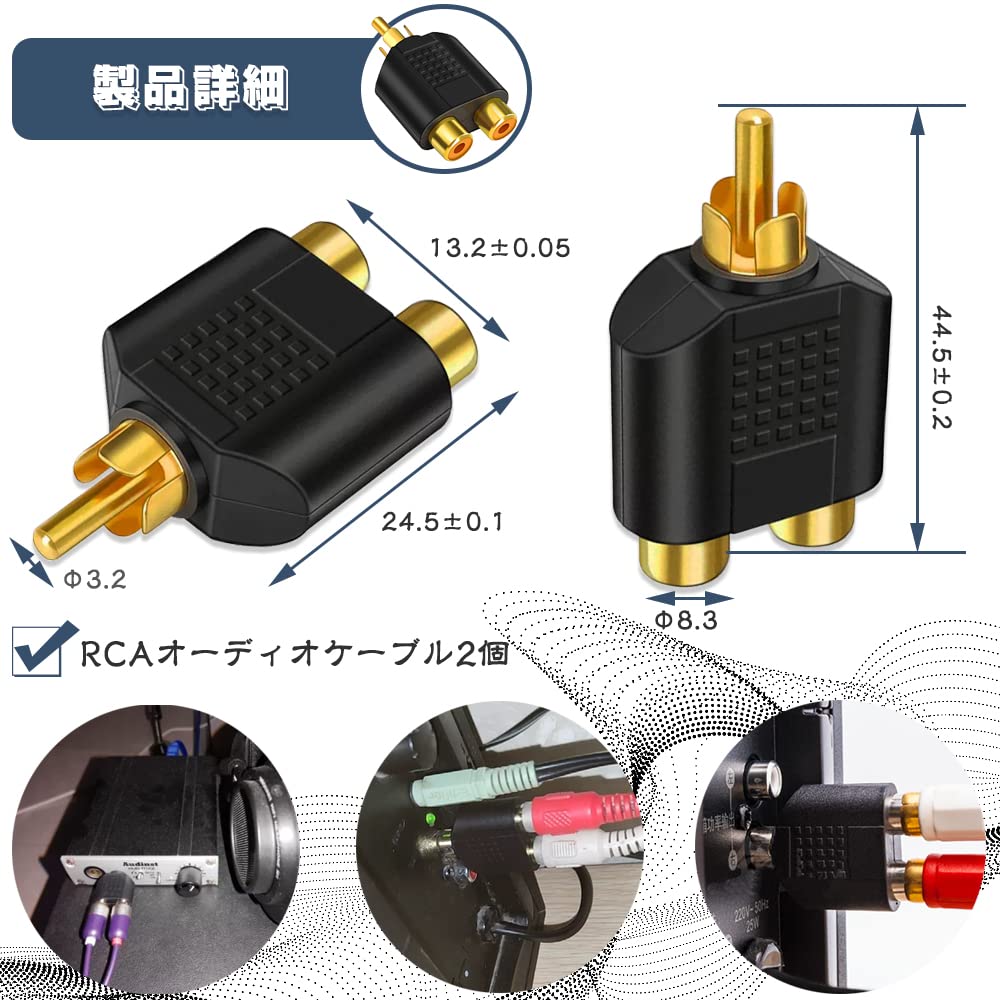 パッケージ内容:RCAオーディオケーブル2個セット RCAプラグ(オス)-RCAプラグ(メス) プラグ:金メッキの耐腐食性コネクターで サイズ:全長44.5mm
