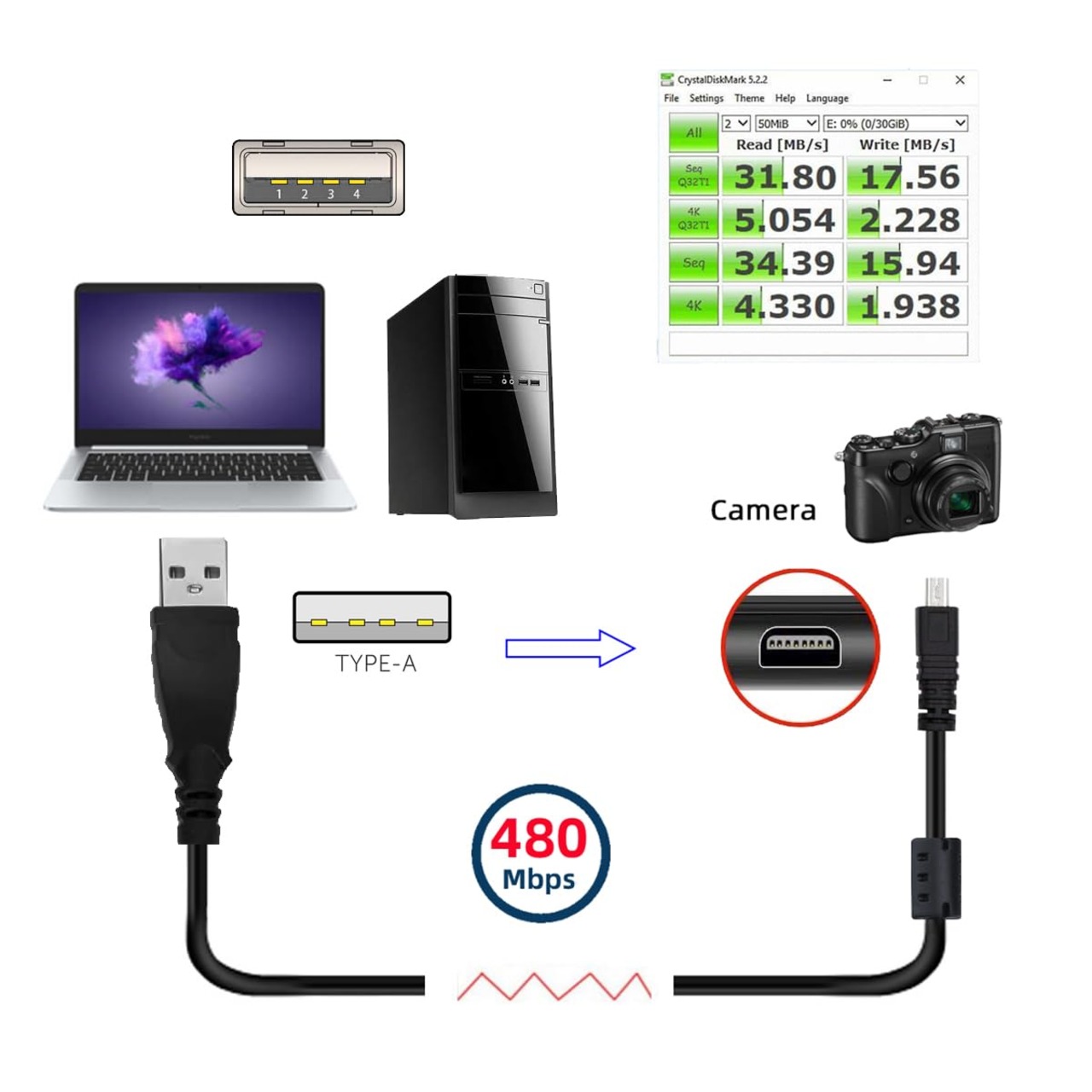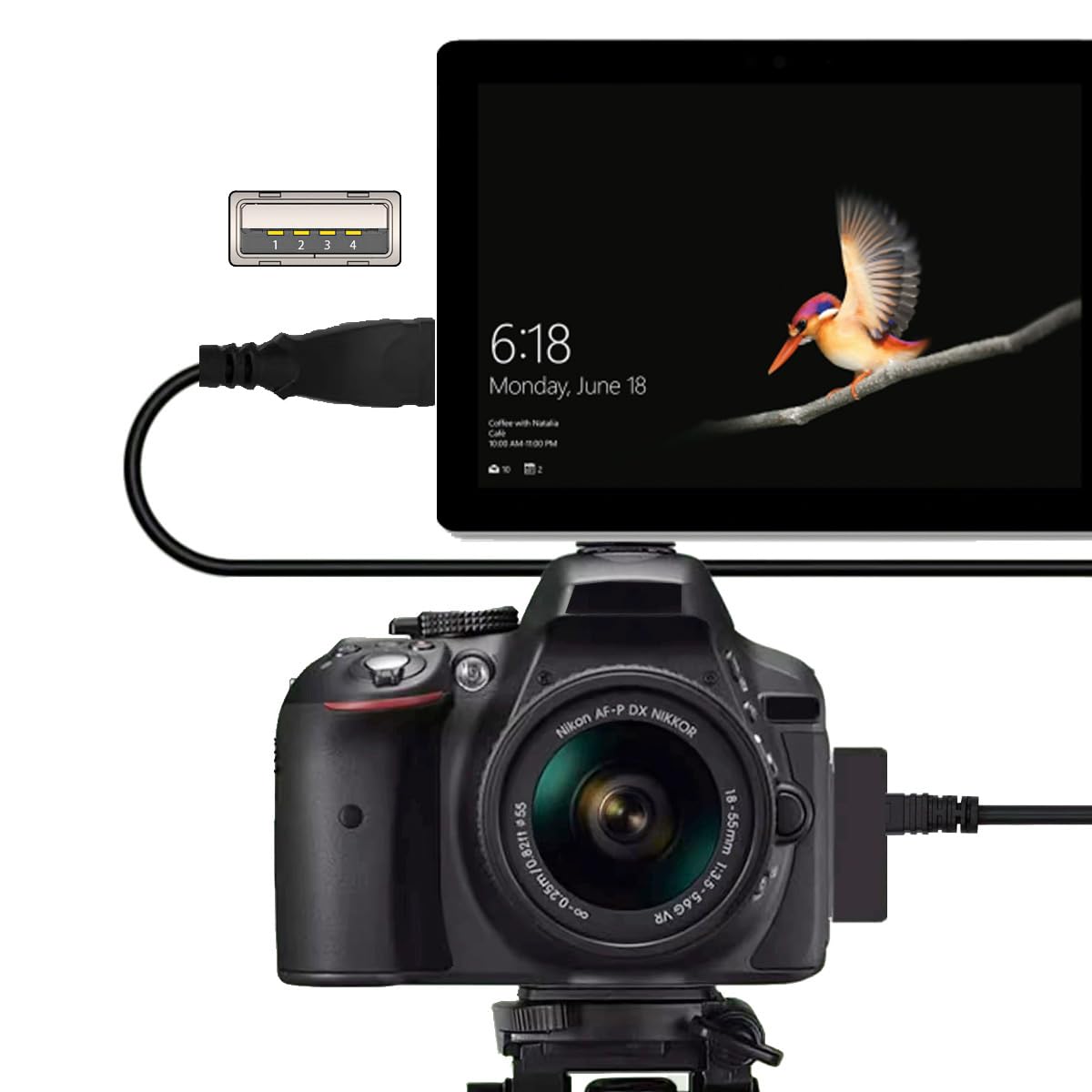 このケーブルは、カメラをコンピューターに接続したり、メモリカードやカメラメモリの内容を読み取ったり、写真、ビデオ、その他のデータを転送したりできます。