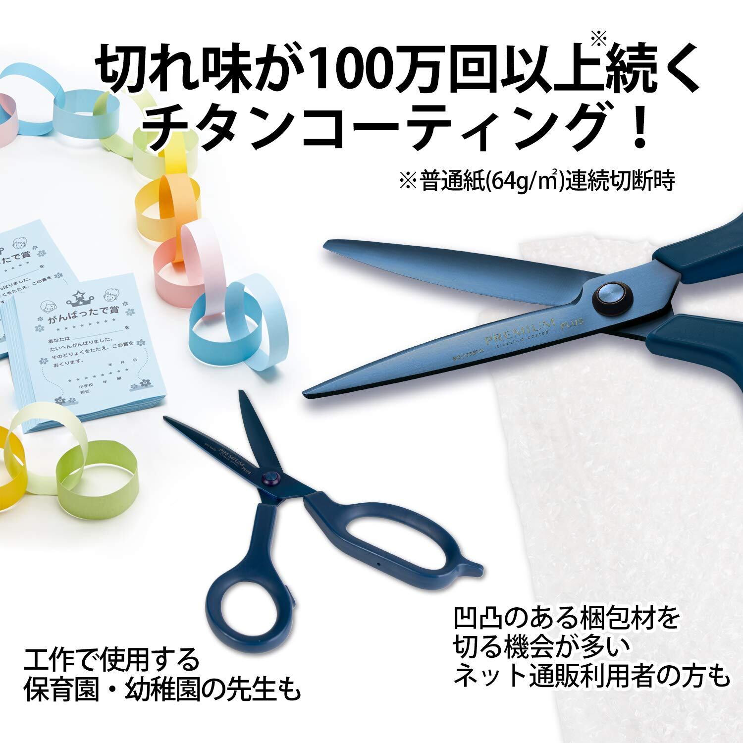 刃にチタニウムをコーティングすることで、50万回以上(PPC用紙を切断した場合)持続する切れ味を備え、さびや汚れにも強くなっています。長さ188mm。刃渡り65mm