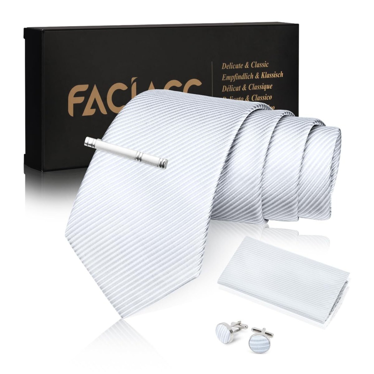 【エレガントなデザイン】ネクタイ本体サイズ: 3.4"× 59"(8.5cm × 150cm)、ハンカチサイズ:12"x 12"(31cm x 31cm)、このFACIACCクラシックなストライプ柄のネクタイはレトロなスタイルとファッションスタイルの完璧な融合です。年齢を問わず、通年お使いいただけます;ご自用はもちろん、絶妙なギフトボックスのパッケージ、新郎と友人とお父さんへの大切な男性への贈り物にも人気のプレゼントです、父の日、クリスマス、バレンタインデー、感謝祭、記念日、誕生日などのプレゼントに最適です。