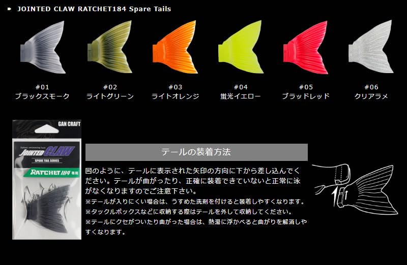 【ジョインテッドクロー ラチェット184用】のスペアテール!フィールドの状況やバスの反応に合わせてテールのカラーを交換する事が出来ます。テールの交換には工具を必要とせず、テールを上下にスライドさせるだけで簡単に取り外しが可能です。