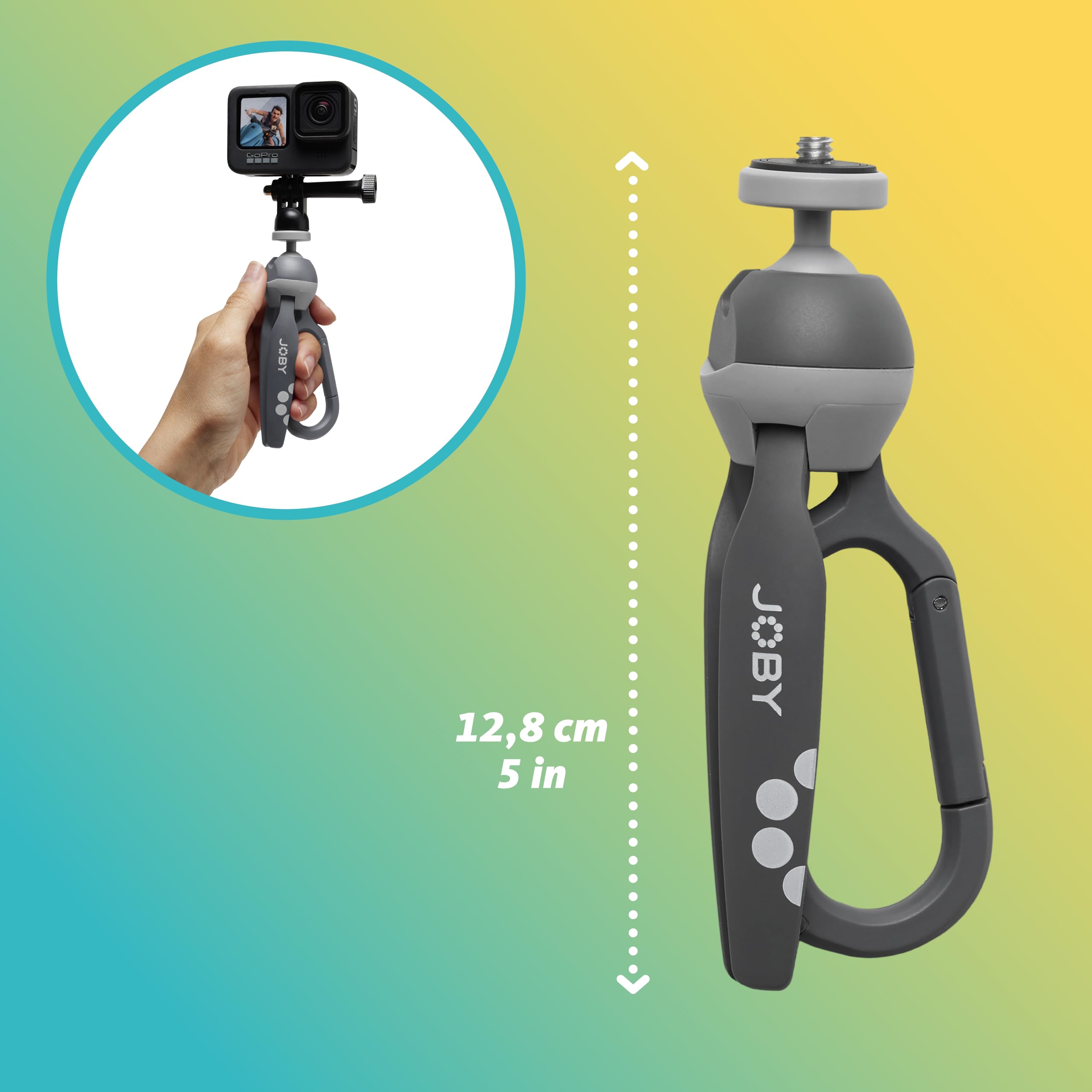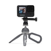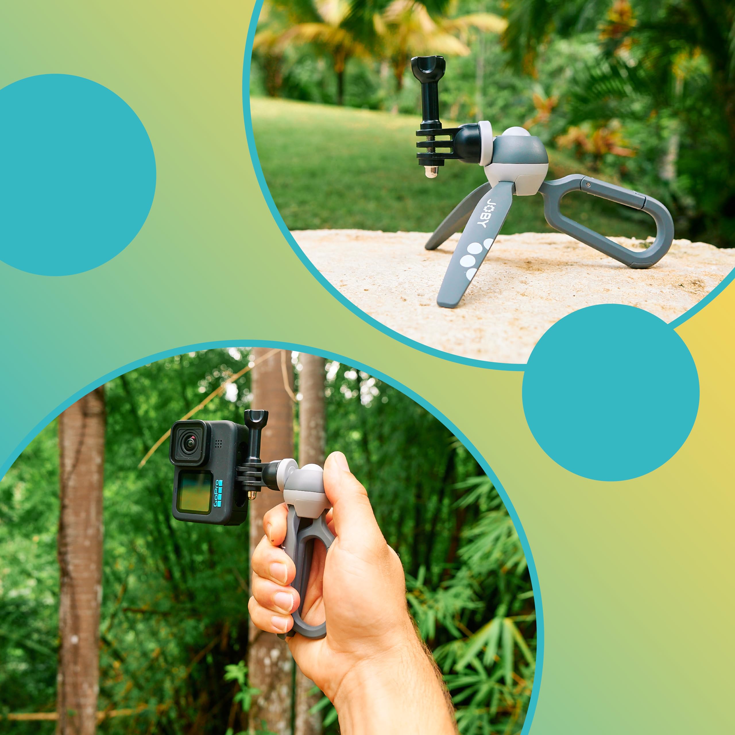 GoPro シリーズをはじめとするアクションカメラを固定できるアダプターが付属しているだけでなく、1/4"ネジを介してコンパクトカメラやビデオライト、マイクなどの三脚としても使えます。