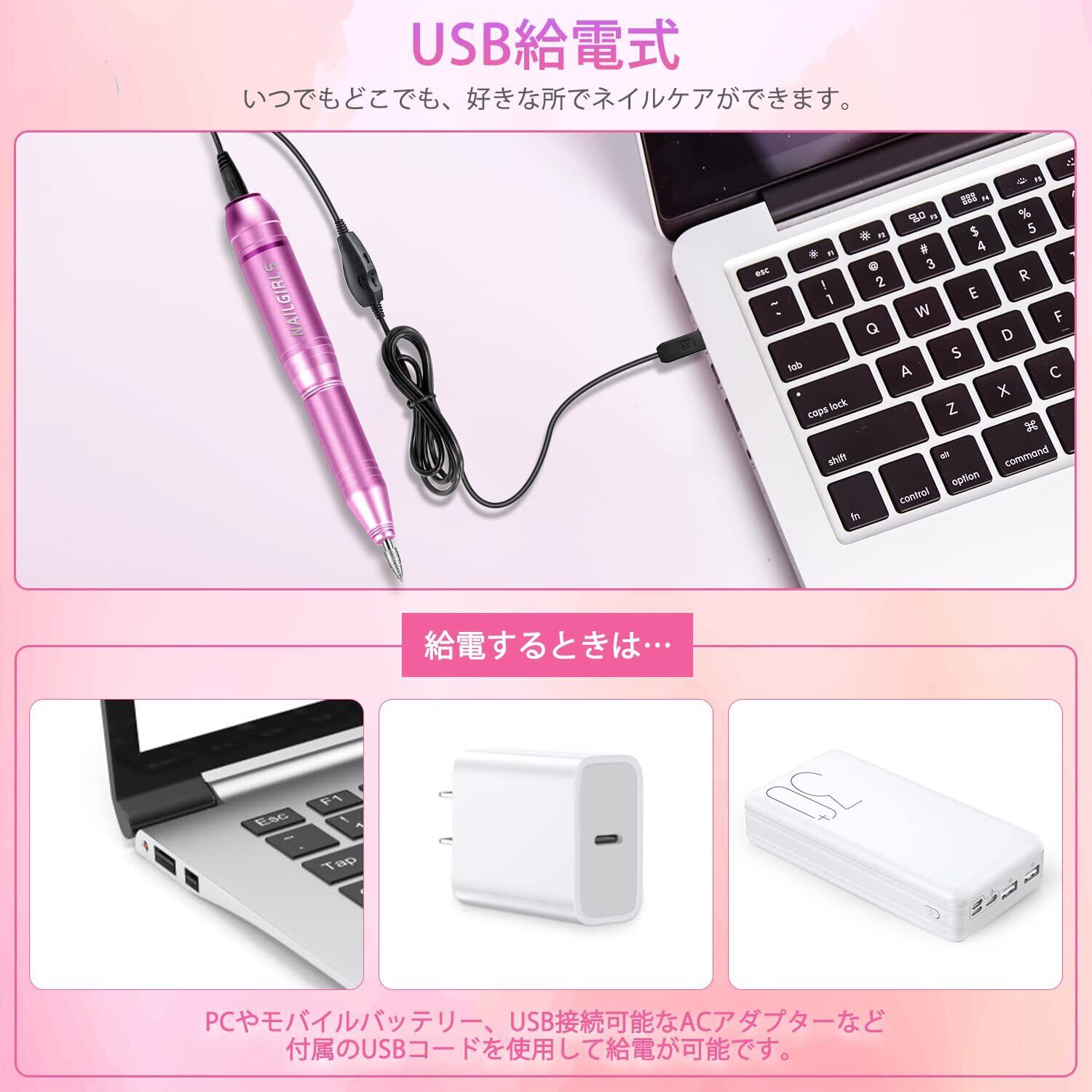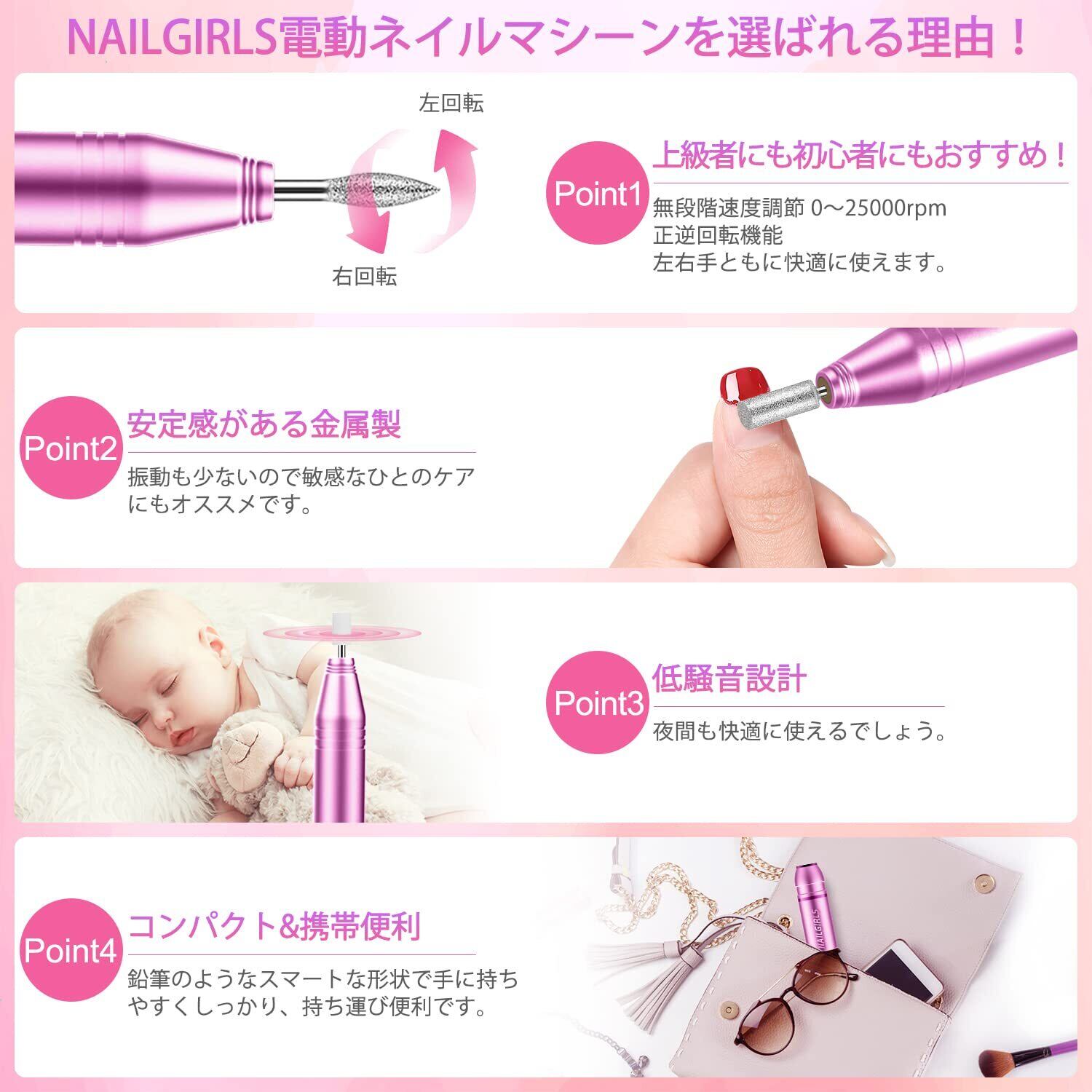 NAILGIRLS 電動ネイルマシン 11個のビット ネイルマシン ビット ジェルネイル オフ キット ネイルケア 爪磨き 甘皮処理 甘皮ケア 正逆回転 無段階変速 USB給電 自宅サロン用(ピンク)