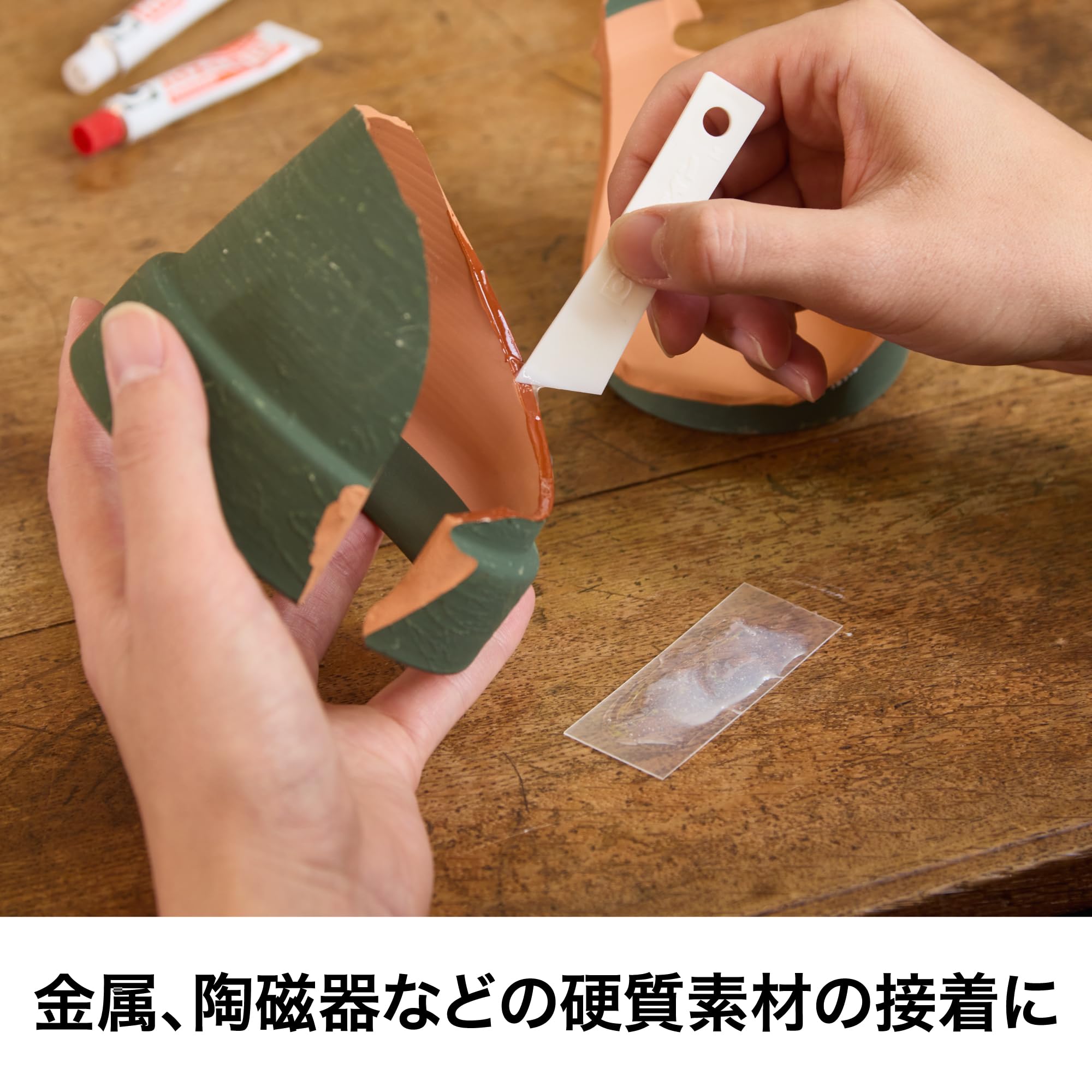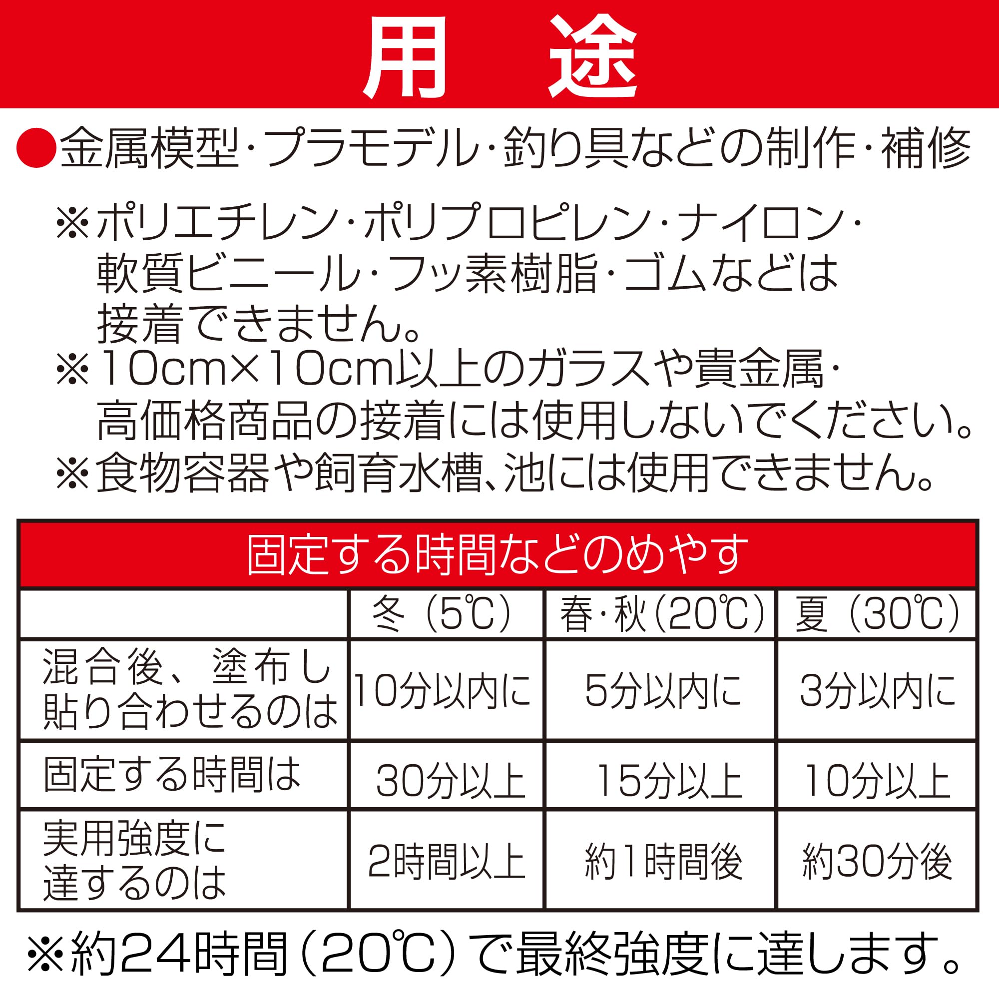 エポキシ樹脂を主成分とする二液を混合して使用するタイプの接着剤。 硬化膜は硬く強靭なため金属などの接着に向いている。 また化学反応で硬化するため肉やせがなく、穴埋め、すき間充填などの応用も可能。 2液混合型エポキシ系接着剤で、5分で硬化しはじめるので急ぎの作業に最適な、スピードタイプ。 金属・ガラス・陶磁器などの硬い物を、カッチリ硬く接着。 A液(主剤)をブルーにしてあり、混合の目安として色が消えるため、大変便利 セミプロの方や多人数での使用に適している。