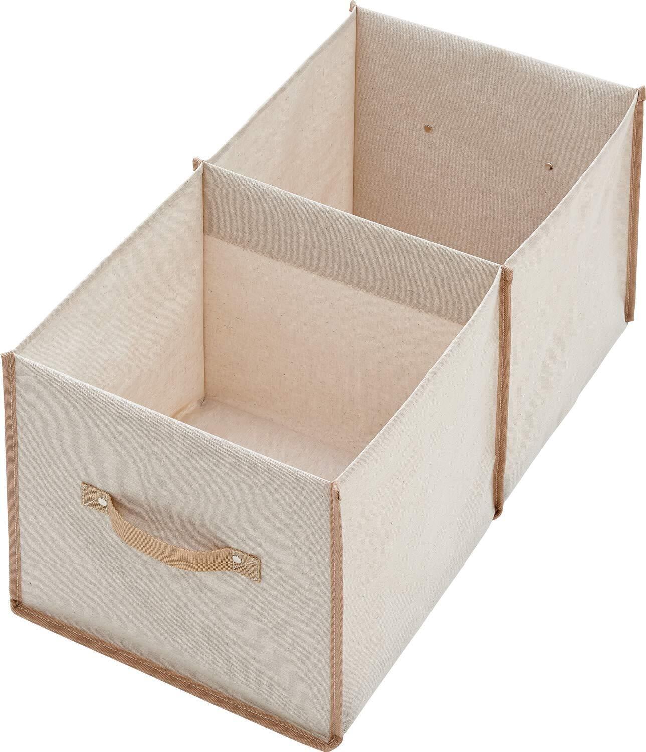 よく使うものをサッと整とんできる大きめサイズの収納ケース。麻をポリエチレンコーティングし他丈夫な生地を使用。両端と仕切りの中材に厚紙も使用しているので、しっかりと自立します。