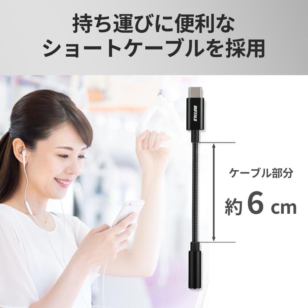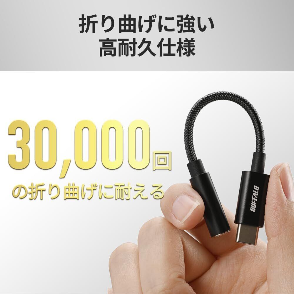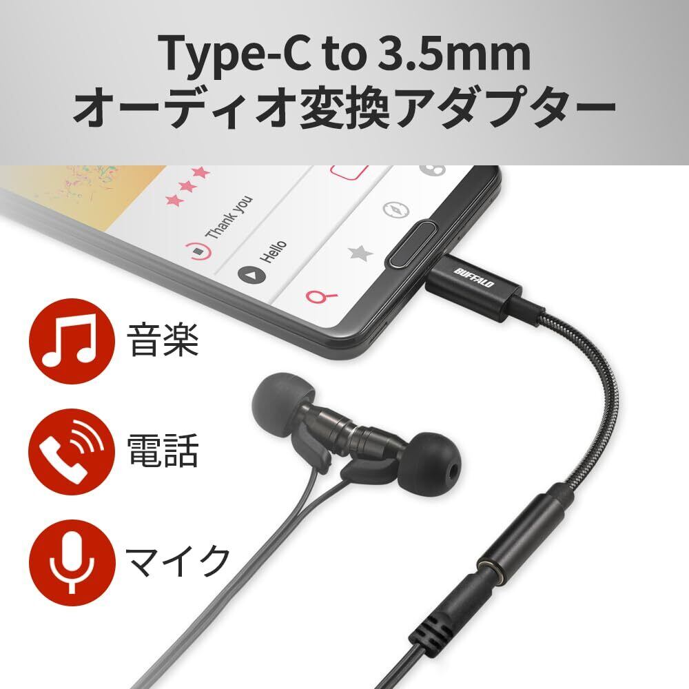 バッファロー USB Type-C 3.5mm 3極 4極 オーディオ 変換 アダプター ハイレゾ対応 DAC搭載 高耐久ケーブル 屈曲耐久試験30,000回クリア イヤホンジャック イヤホン ヘッドホン ヘッドセット マイク 音量調整 【 iPhone 16 / 16 Pro/iPad/Mac/Android スマートフォン タブレット 対応 】 ブラック BSMPC355HRBK