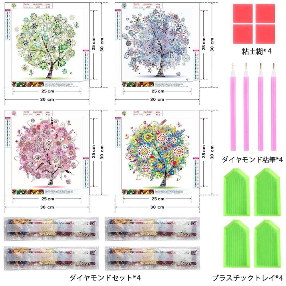 セット内容:ダイヤモンド絵画セット4セット(フレームを含まない)、ダイヤモンドセット+ダイヤモンド粘筆+プラスチックトレイ+油絵布+粘土糊各4点を含む。油絵布サイズ:約30×30 cm、操作サイズ:約25 cm*25 cm。