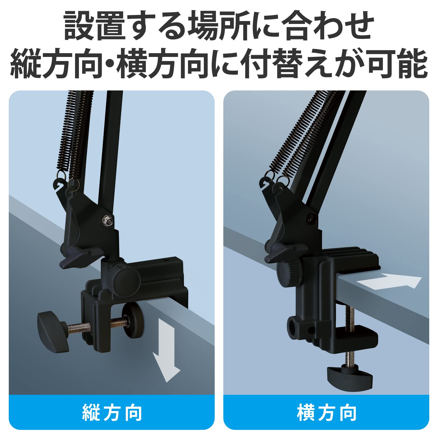 ●縦にも横にも固定できる2Wayのスマートフォン・タブレット用フレキシブルアームスタンドです。●クランプは設置する場所に合わせて、縦方向や横方向に付け替えが可能です。●縦方向に固定するとベッドのヘッドボードに取り付けられるので横になった状態で使用でき、横方向に固定するとサイドテーブルなどにも取り付けて使用できます。●フレキシブルアームと先端アームで、機器本体と顔との距離や高さを好きな位置に調節して使用できます。●ホルダーの接続部分にボールジョイントを採用しているので、角度や向きを自由に調節できます。●機器本体をホルダーに設置したまま充電ケーブルの接続が可能です。●ホルダー部には、機器本体のズレを防ぐシリコン素材の滑り止めが付いています。●4.6~12.9インチのスマートフォンやタブレットに対応しています。●本製品の構造上、機器本体を真下に向けて設置すると、ホルダーから落下する恐れがあるため、必ず角度をつけて設置してください。●※フレキシブルアームの向きを変える際に、アーム最下部のネジの角度によっては、クランプにあるアーム固定ネジと当たることがあるのでご注意ください。●エレコム社環境認定基準を1つ以上満たし、『THINK ECOLOGY』マークを表示した製品です。●環境保全に取り組み、製品の包装容器におけるプラスチック重量を、社内基準製品より20%以上削減した製品です。